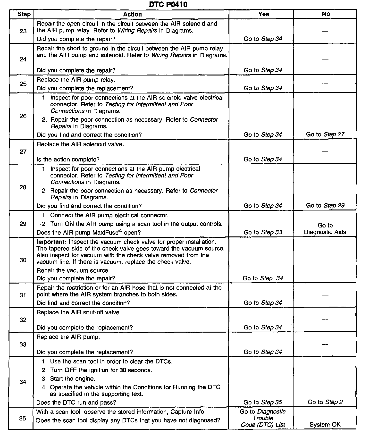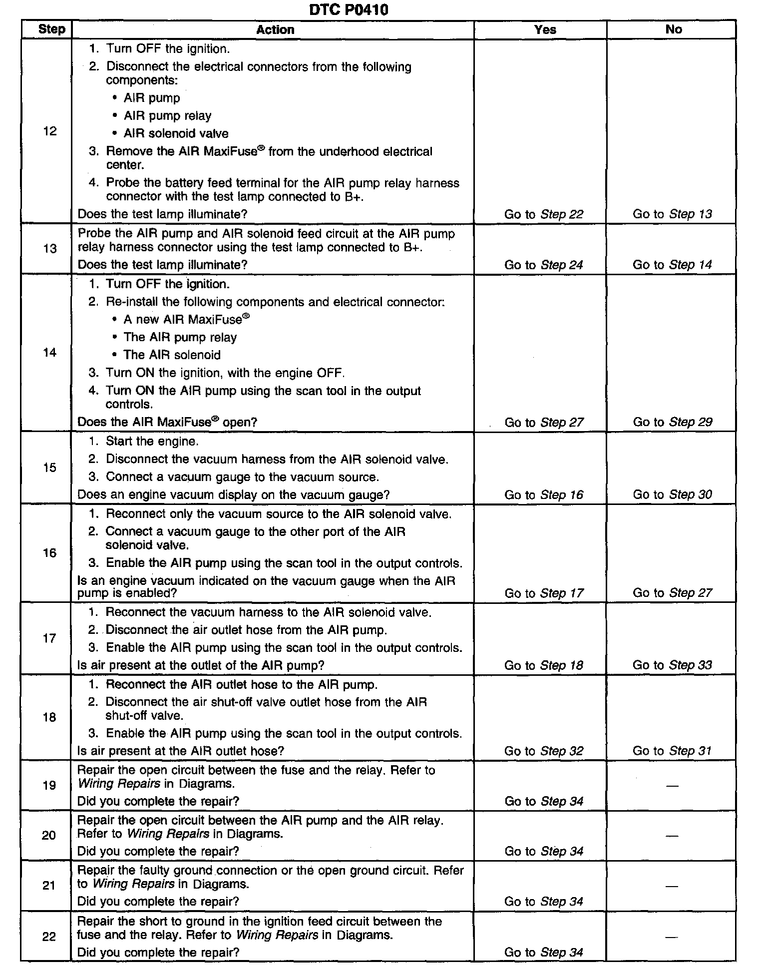 If the PCM determines that the HO2S voltages for both banks did not respond as expected during the tests, Diagnostic Trouble Code (DTC) P0410 sets. If only one sensor responded, the PCM sets either a DTC P1415 or P1416 to indicate on which bank the AIR system is inoperative.