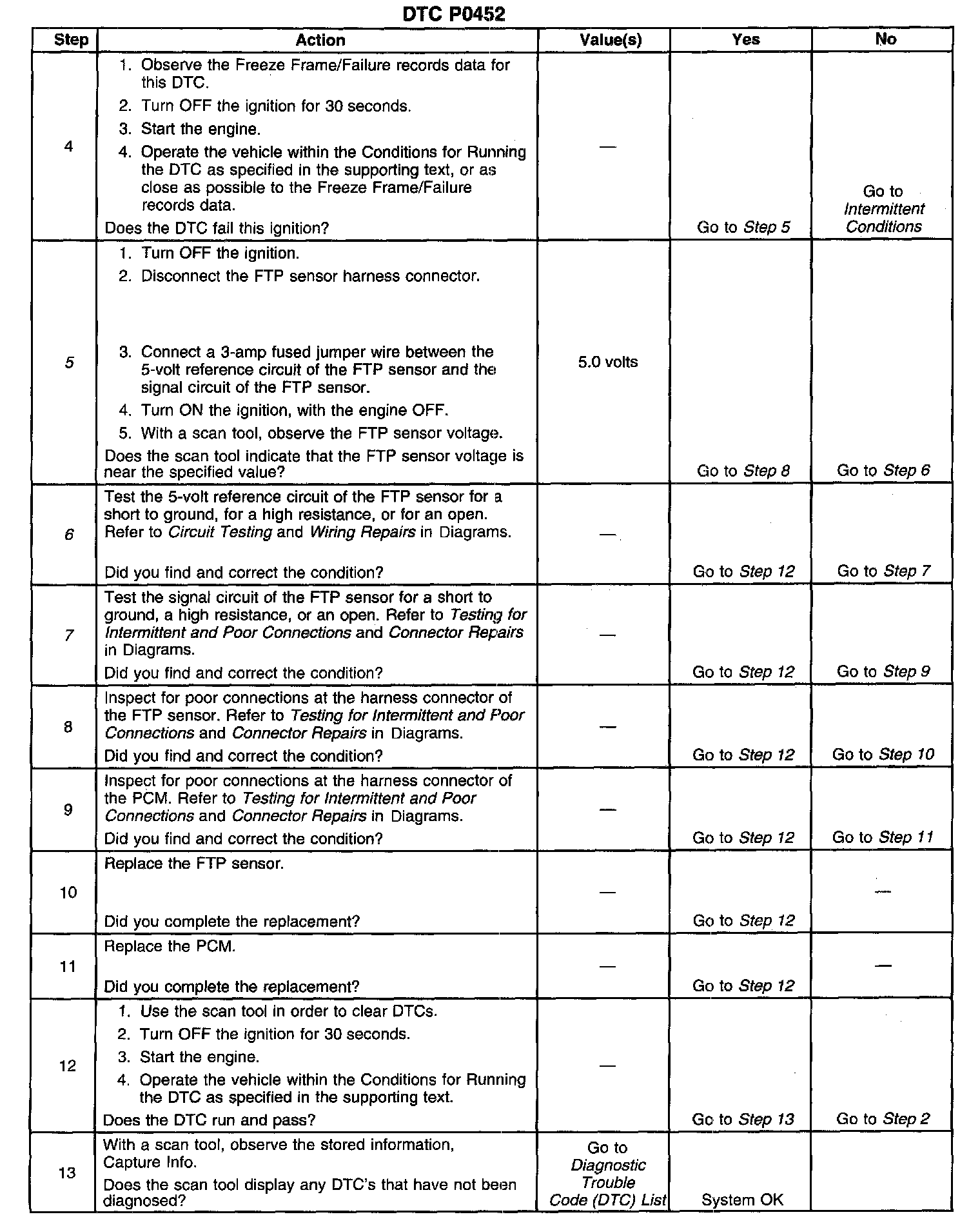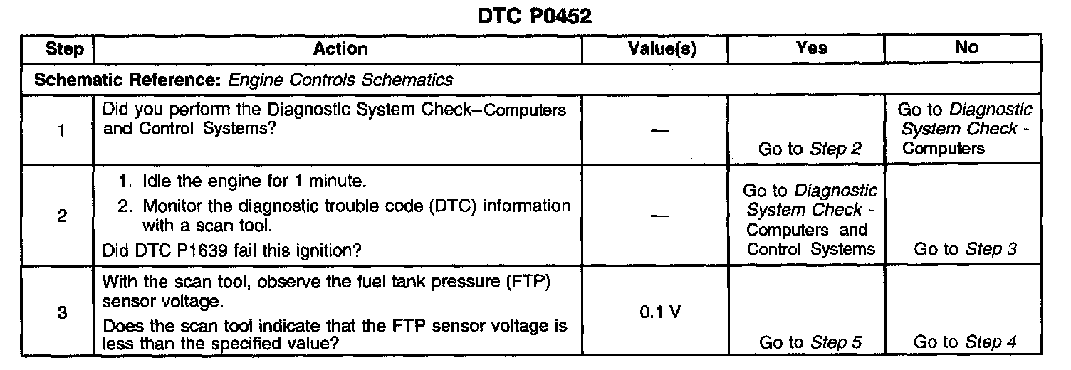 CIRCUIT DESCRIPTIONThe Powertrain Control Module (PCM) monitors the Fuel Tank Pressure (FTP) sensor signal in order to detect vacuum decay and excess vacuum during the enhanced Evaporative Emission (EVAP) diagnostic. The PCM supplies a 5-volt reference and ground to the sensor. The FTP sensor signal voltage increases when the fuel tank pressure decreases. Negative pressure or vacuum indicates high voltage. The FTP sensor signal voltage decreases when the fuel tank pressure increases. Positive pressure indicates low voltage. This DTC sets when the FTP sensor signal goes below a predetermined value.