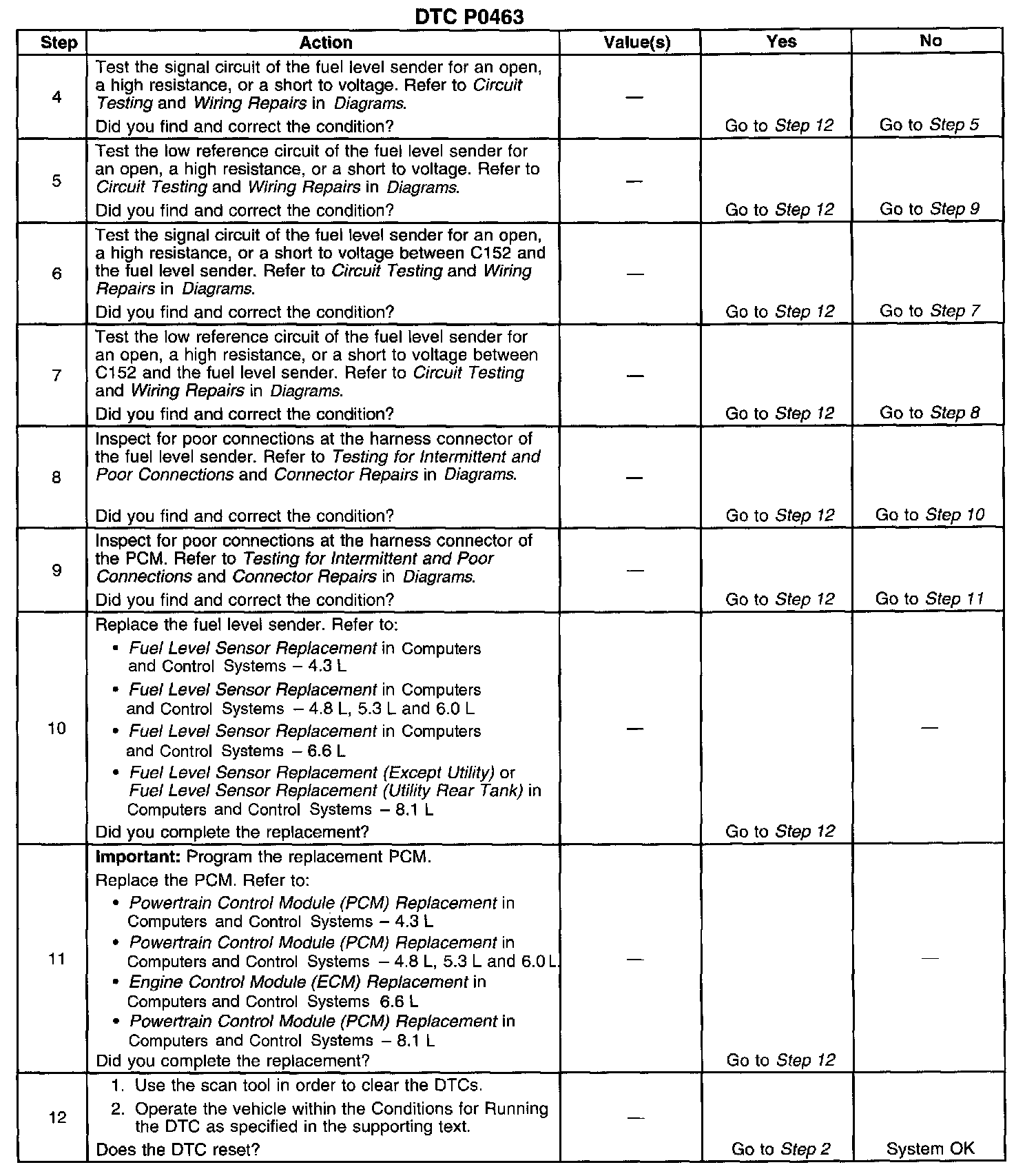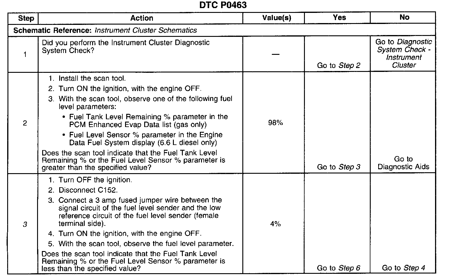 CIRCUIT DESCRIPTIONThe fuel level sender changes resistance based on fuel level. The PCM monitors the signal circuit of the fuel level sender in order to determine fuel level. When the fuel tank is full, the sender resistance is high and the PCM senses a high signal voltage. When the fuel tank is empty, the sender resistance is low and the PCM senses a low signal voltage. The PCM uses the signal circuit of the fuel level sender in order to calculate the total remaining fuel %) in the tank. The PCM sends the fuel level percent via the class 2 serial data circuit to the instrument cluster in order to control the fuel gauge. The fuel level information is also used for misfire and EVAP diagnostics.