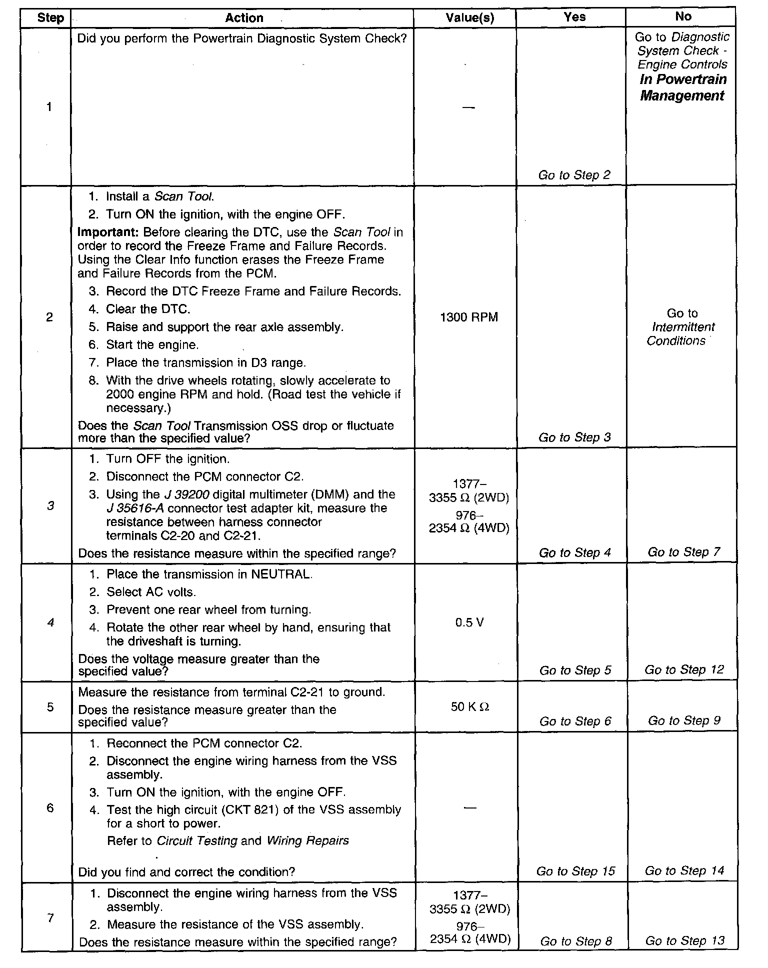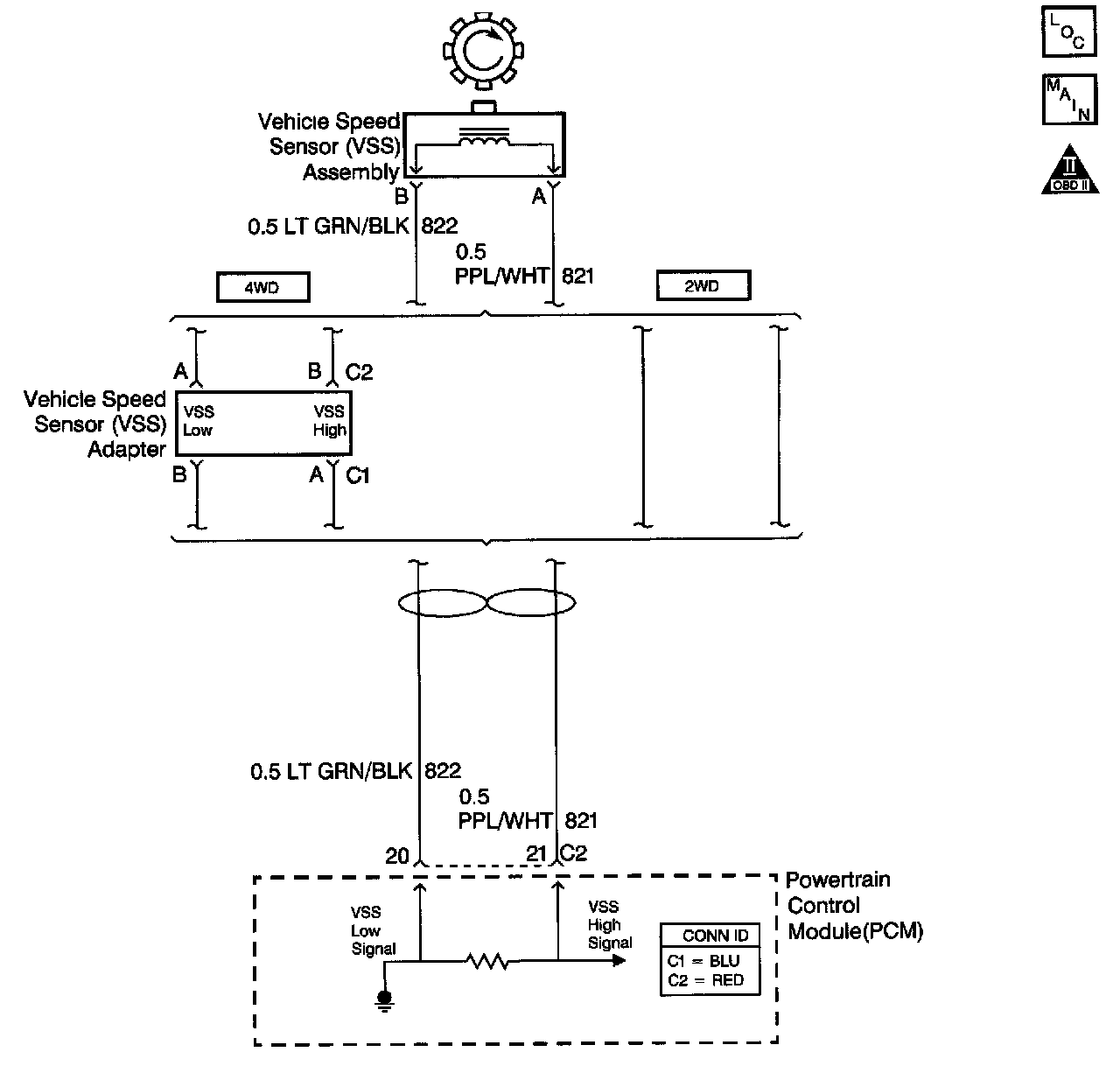 The Vehicle Speed Sensor (VSS) assembly provides vehicle speed information to the Powertrain Control Module (PCM). The VSS assembly is a permanent magnet generator. The VSS produces an AC voltage as rotor teeth on the output shaft of the transmission (2WD) or transfer case (4WD) pass through the sensor's magnetic field. The AC voltage level and the number of pulses increase as the speed of the vehicle increases. The PCM converts the pulsing voltage to vehicle speed. The PCM uses the vehicle speed signal to determine shift timing and Torque Converter Clutch (TCC) scheduling.