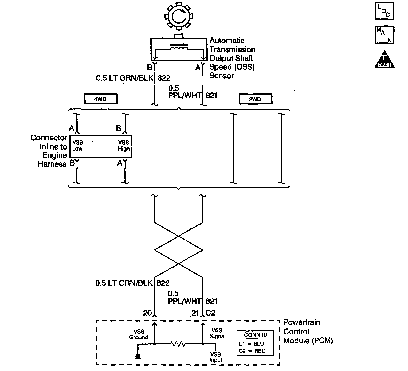 The output (shaft) speed (AT OSS) sensor, which is a permanent magnet generator, provides the vehicle speed information to the Powertrain Control Module (PCM). The PM generator produces a pulsing AC voltage as the transmission speed sensors rotor teeth pass through the sensor's magnetic field. The AC voltage level and the number of pulses increase as the speed of the vehicle increases. The PCM then converts the pulsing voltage to a digital signal for vehicle speed. The vehicle speed is used for engine and transmission calculations.