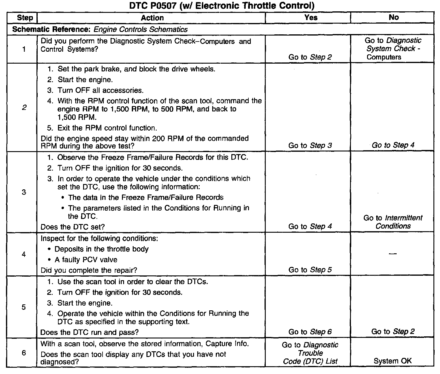 CIRCUIT DESCRIPTIONThe electronic throttle control system uses various inputs from the Powertrain Control Module (PCM). This system uses these inputs in order to control the idle speed through serial data circuits to the Throttle Actuator Control (TAC) module. The DC motor, which is located on the throttle body, activates the throttle plate. In order to decrease idle speed, the TAC module commands the throttle closed reducing air flow into the engine and the idle speed decreases. In order to increase the idle speed, the TAC module commands the throttle plate open, allowing more air in order to bypass the throttle plate. If the actual idle RPM does not match the desired idle RPM within a calibrated time, this DTC will set.