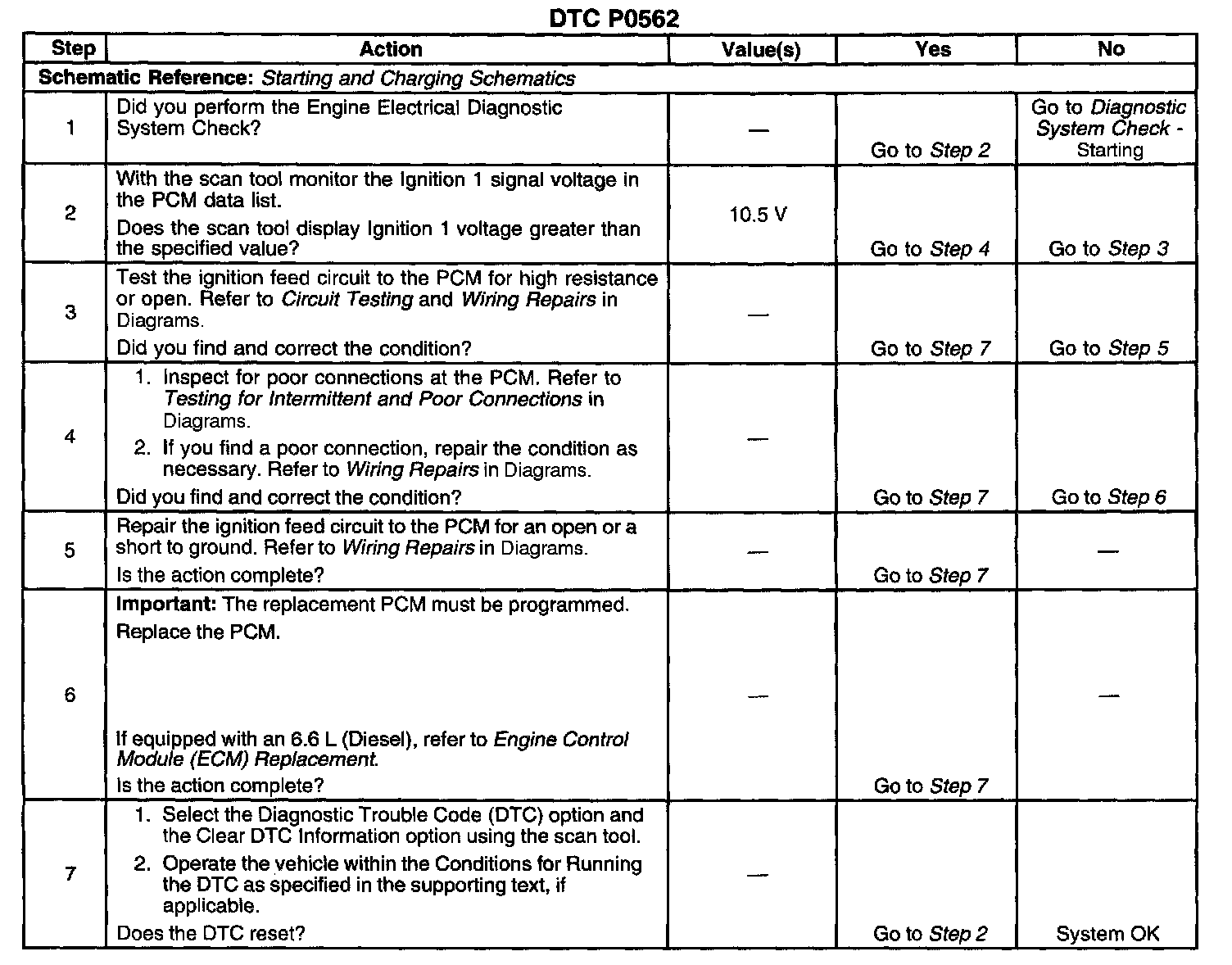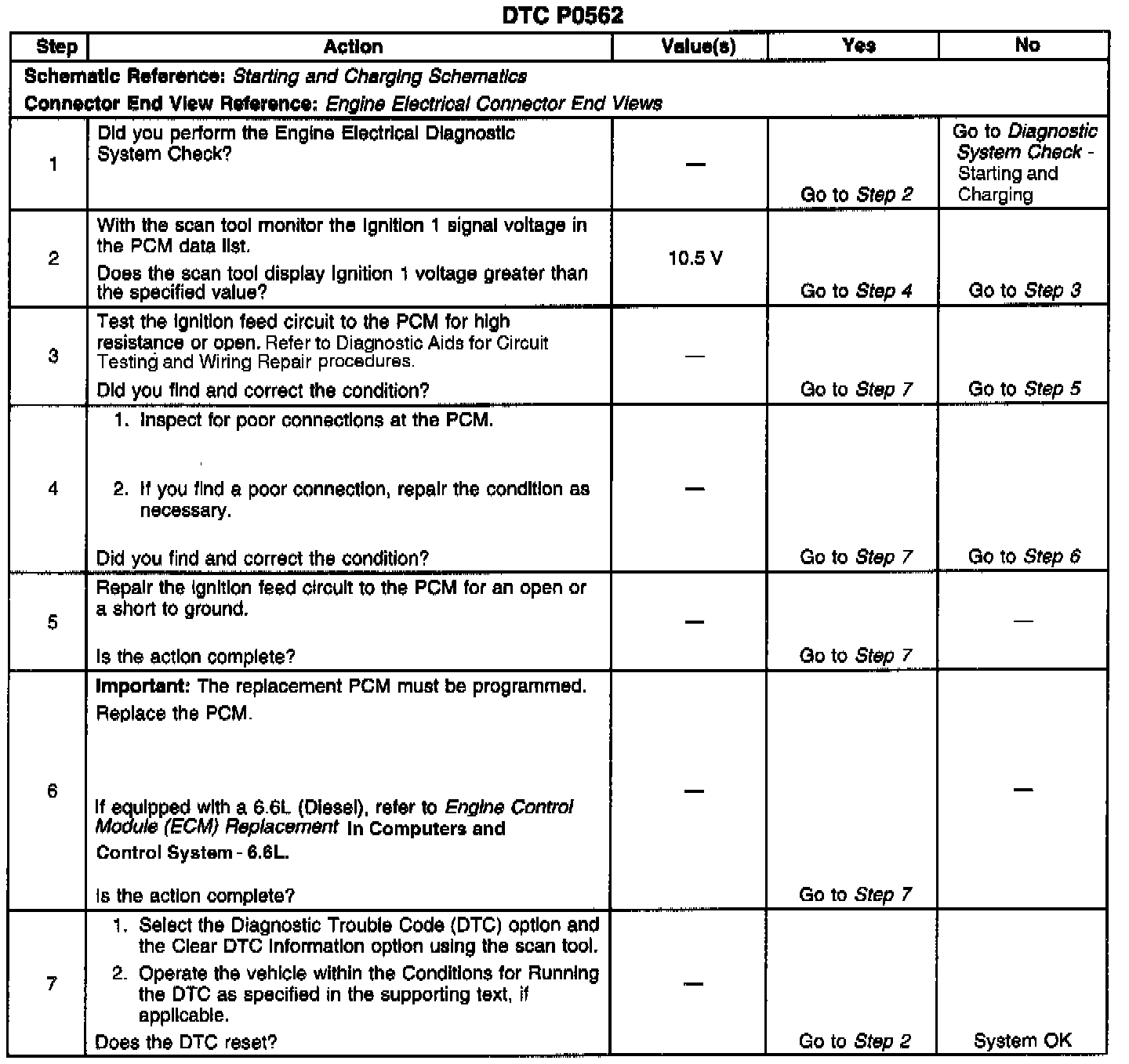 CIRCUIT DESCRIPTIONThe PCM monitors the system voltage to make sure that the voltage stays within the proper range. If the PCM detects an excessively low system voltage DTC P0562 will set.