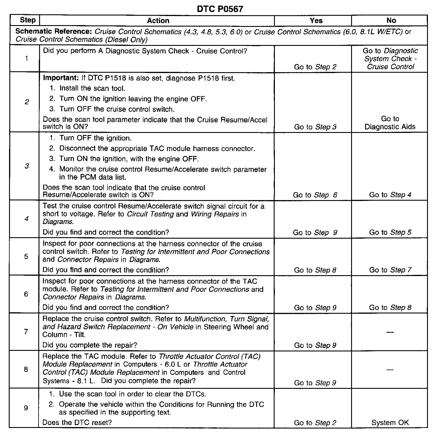 CIRCUIT DESCRIPTIONThe Cruise Resume/Accel switch is an input to the Throttle Actuator Control (TAC) Module. This cruise control information is supplied to the PCM via serial data. This allows the PCM and TAC module to control and hold a requested speed. The Cruise Resume/Accel switch sends an ignition positive voltage signal to the TAC module when the switch is applied. This DTC sets if the TAC module senses a voltage on the Resume/Accelerate switch signal circuit when voltage is not expected