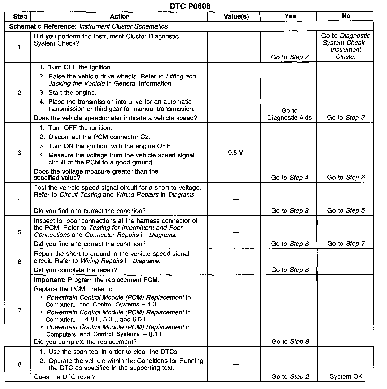 CIRCUIT DESCRIPTIONThe PCM creates the vehicle speed output signal by pulsing the circuit to ground. The PCM pulses the circuit at the same rate as the vehicle speed signal input. The PCM monitors the voltage on the vehicle speed output circuit. If the PCM determines the voltage is out of the normal operating range, a DTC sets.