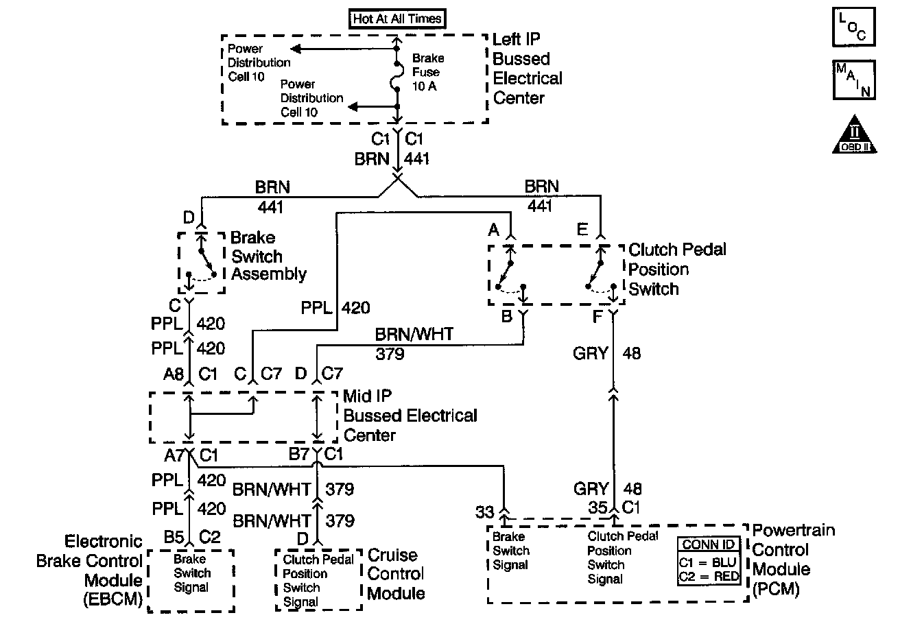 Battery voltage is supplied from the brake fuse to the clutch switch. The clutch switch is a normally-closed switch. When the clutch pedal is released, the clutch pedal position switch signal circuit is pulled up to B+. When the clutch pedal is applied, the switch opens, and the voltage drops to 0 volts.