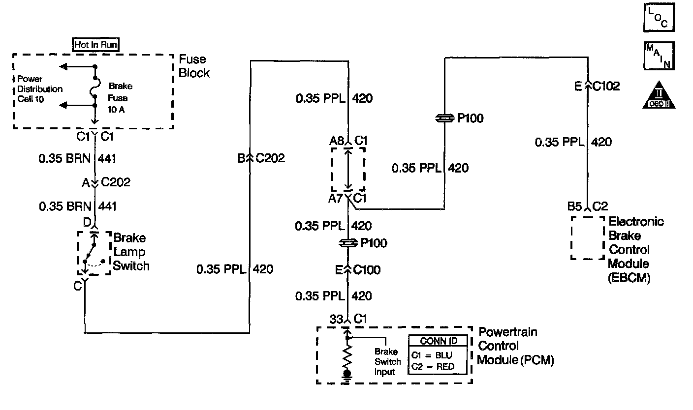 The TCC/Stoplamp switch indicates the brake pedal status. The normally closed brake switch supplies a B+ signal to the Powertrain Control Module (PCM). The signal voltage circuit opens when the brakes are applied.