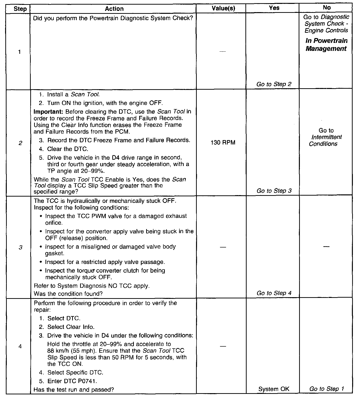 When the PCM detects a high TCC slip speed when the PCM commands the TCC ON, then DTC P0741 sets. DTC P0741 is a type B DTC.