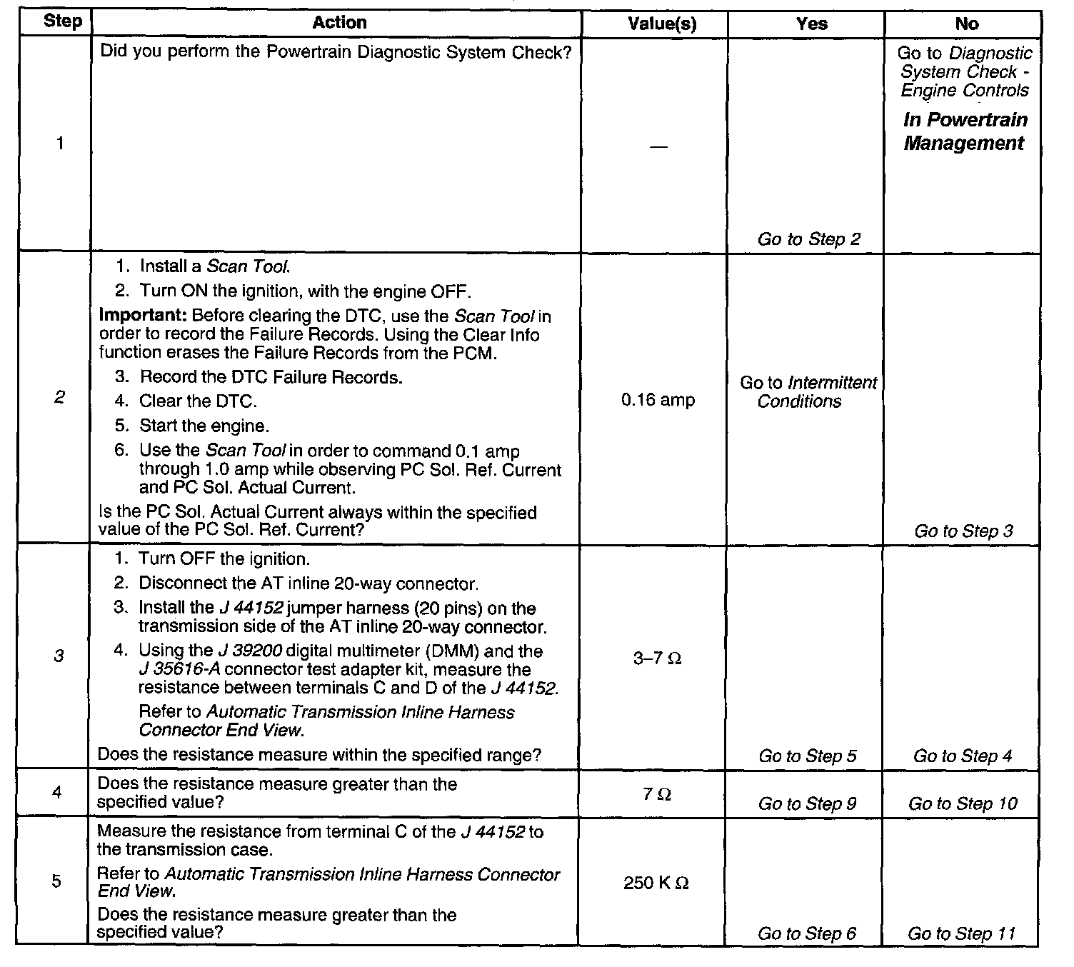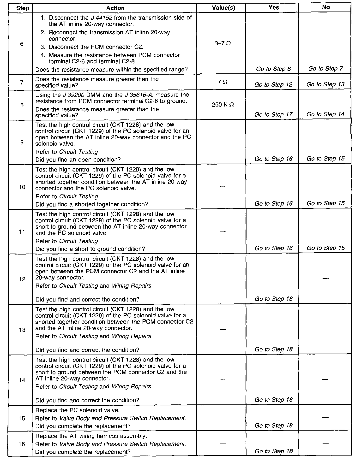 3. This step tests the PC solenoid valve and automatic transmission wiring harness assembly for incorrect resistance.