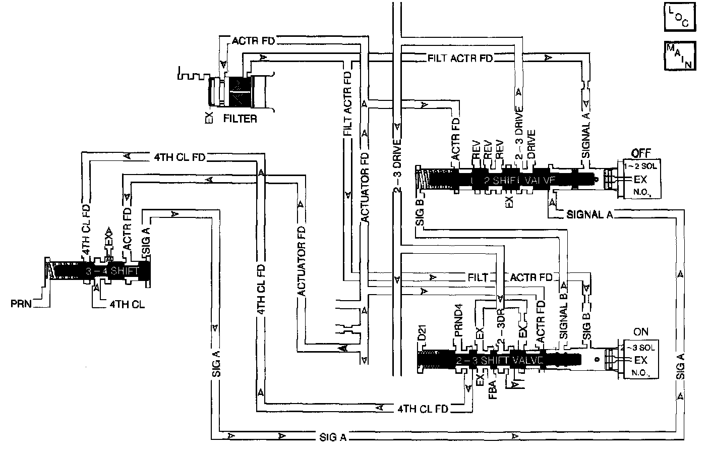 The 1-2 Shift Solenoid (SS) valve controls the fluid flow action on the 1-2 and the 3-4 shift valves. The 1-2 SS valve is a normally-open exhaust valve that is used with the 2-3 SS in order to allow four different shifting combinations.