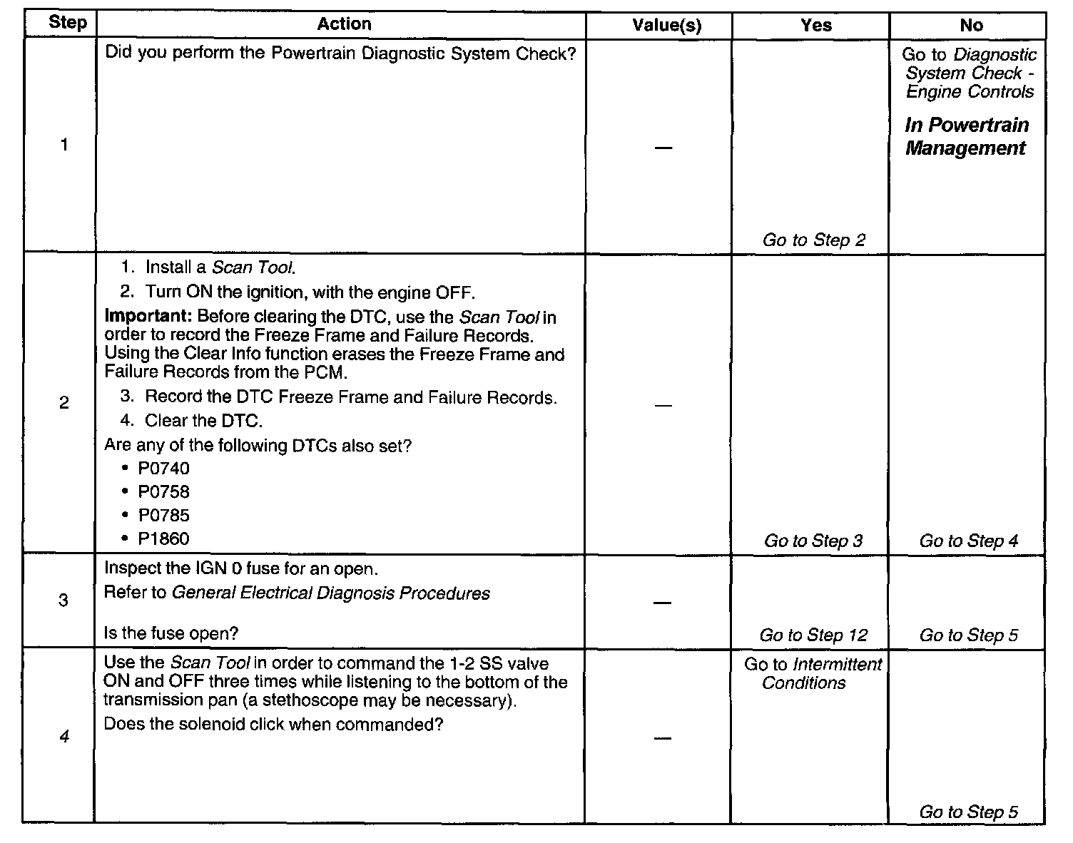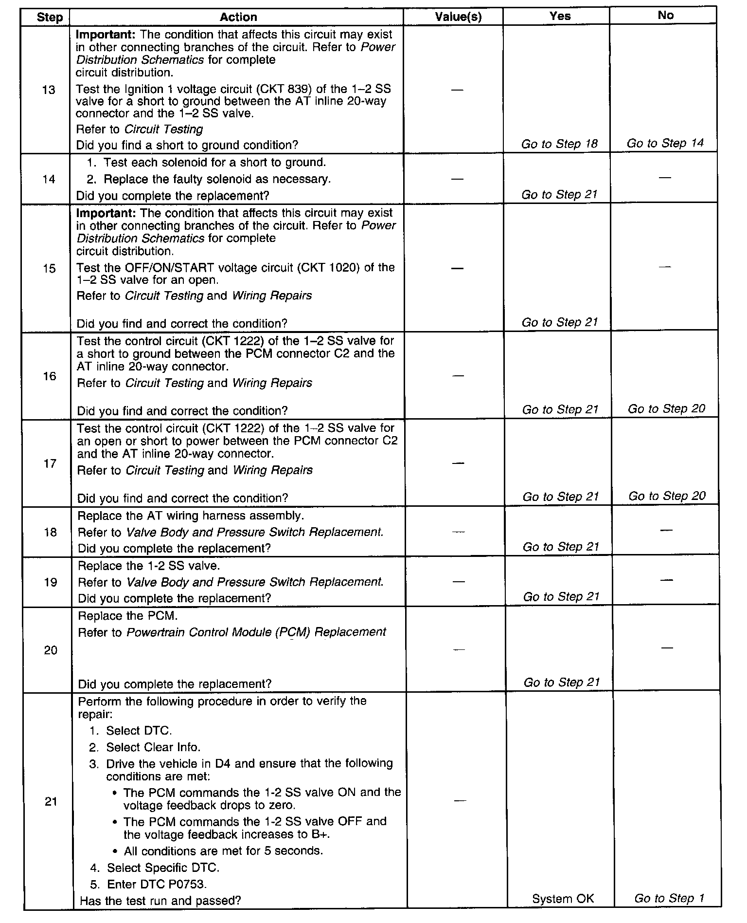 When the PCM detects a continuous open, short to ground or short to power in the 1-2 SS valve circuit, then DTC P0753 sets. DTC P0753 is a type B DTC.