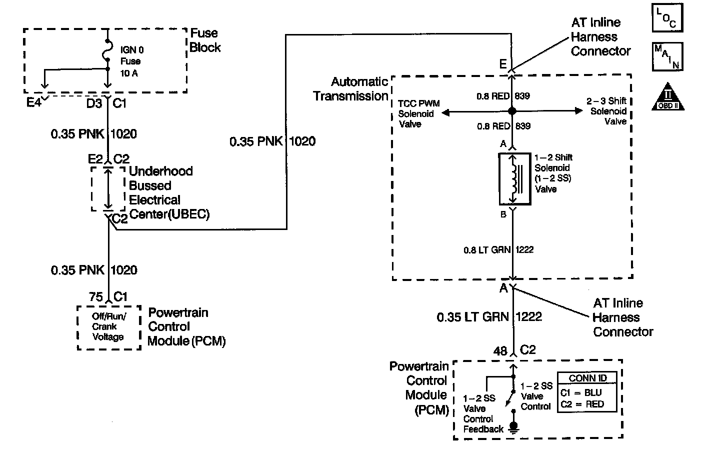 The 1-2 Shift Solenoid (SS) valve controls the fluid flow action on the 1-2 and the 3-4 shift valves. The 1-2 SS valve is a normally-open exhaust valve that is used with the 2-3 SS valve to allow for four different shifting combinations. The 1-2 SS valve attaches to the control valve body within the transmission. The ignition voltage goes directly to the 1-2 SS valve. The PCM controls the 1-2 SS valve by providing the ground path through the 1-2 shift solenoid valve control circuit.