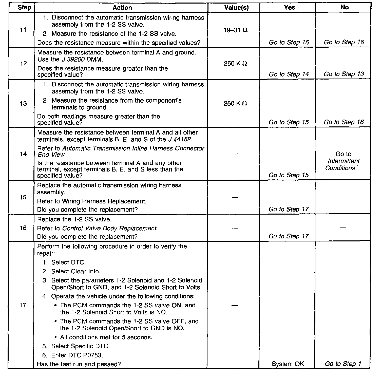 When the Powertrain Control Module (PCM) detects a continuous open or short in the 1-2 SS valve circuit or the 1-2 SS valve, then DTC P0753 sets. DTC P0753 is a type C DTC. For California emissions vehicles and vehicles under 8600 GVW, DTC P0753 is a type A DTC.