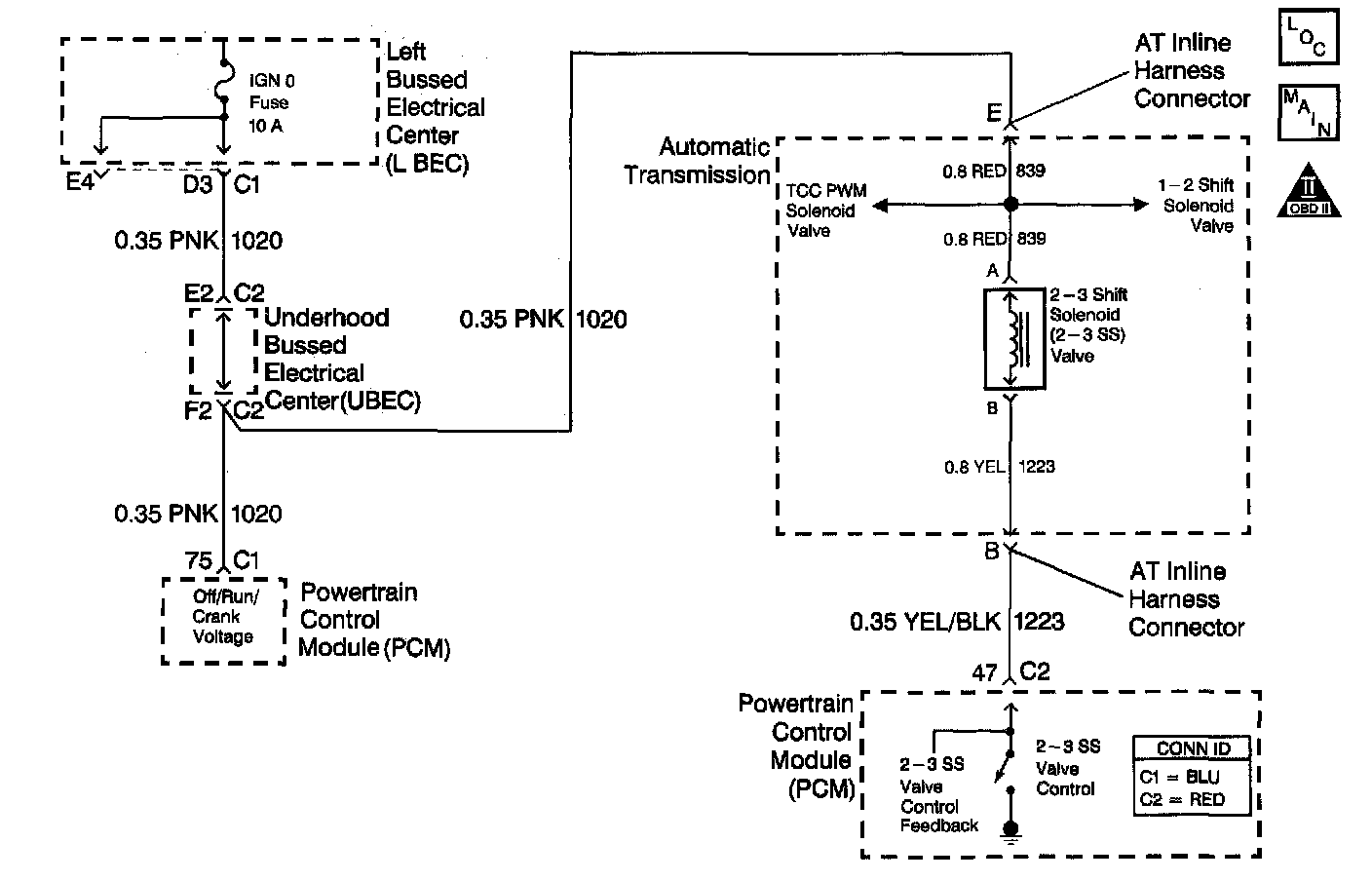 ^ The PCM commands the 2-3 SS valve ON, and the voltage input remains high (B+).