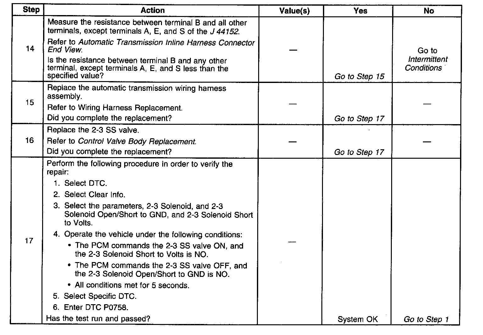 If the PCM detects a continuous open or short in the 2-3 SS valve circuit or the 2-3 SS valve, then DTC P0758 sets. DTC P0758 is a type C DTC. For California emissions vehicles and vehicles under 8600 GVW, DTC P0758 is a type A DTC.
