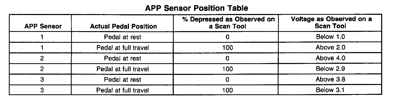 5. This step isolates an internal APP sensor failure. The condition may only occur at a certain accelerator pedal position. Monitoring the APP angles for sensor 2 and sensor 3 is an accurate way of verifying the actual position of the pedal. The APP angles for all 3 sensors should be within a few percent of each other. If the pedal is at rest the APP angle for all 3 sensors should be 0 percent. If the pedal is fully depressed all APP angles should be 100 percent.
