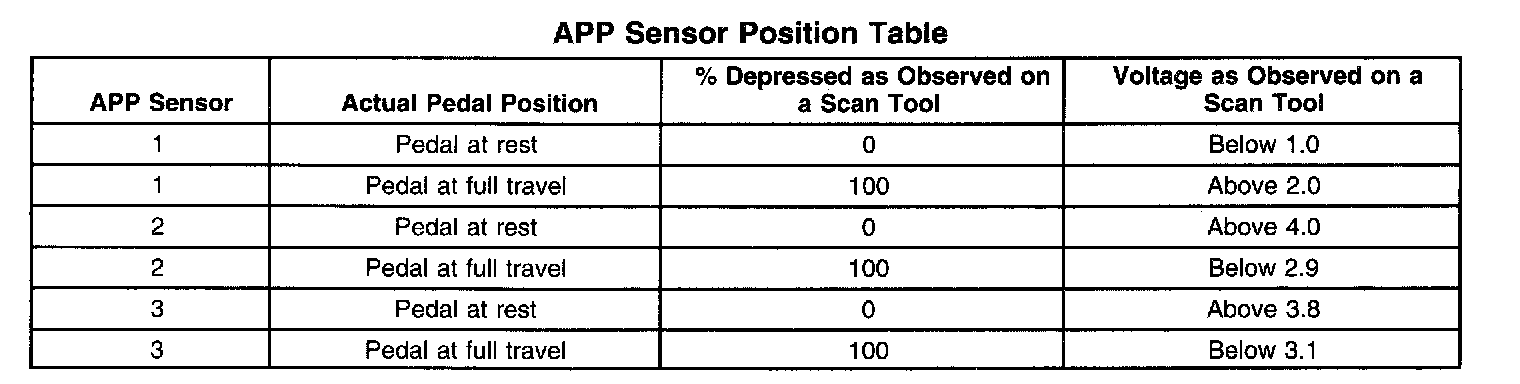 The table shows the percentage and voltage readings of the scan tool based on the position of the APP.