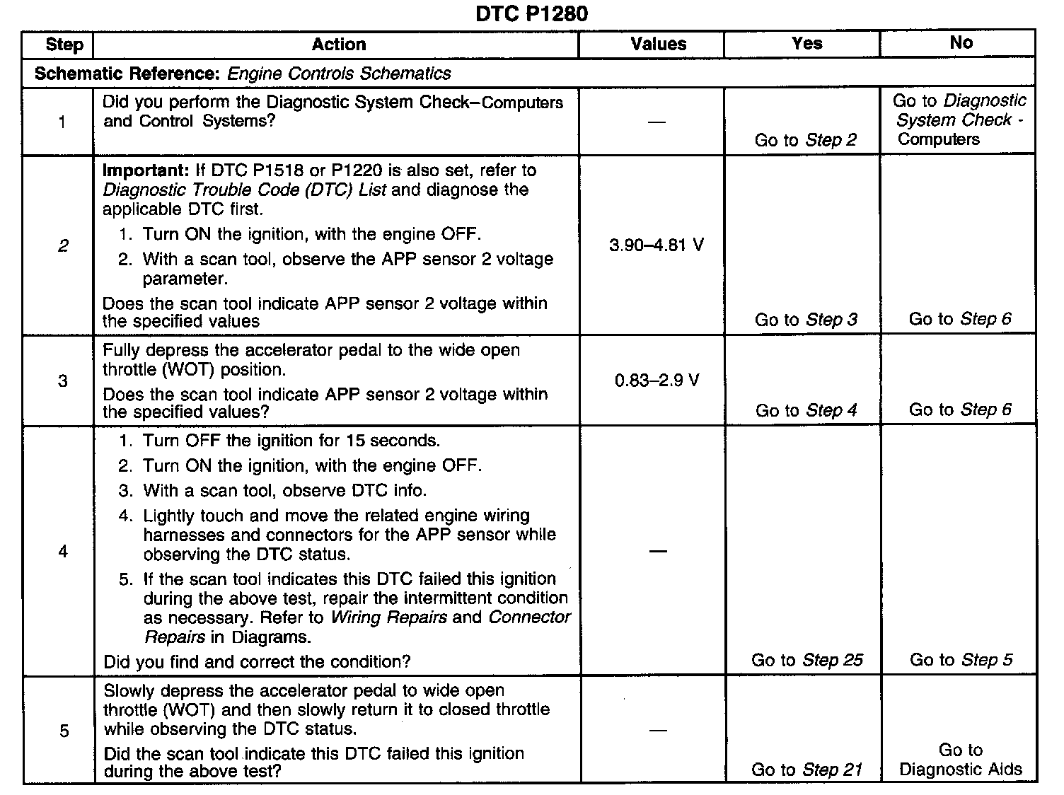 2. The TP sensor 2 and the APP sensor 2 share a common 5-volt reference source. Diagnose the DTC P1220 first if it is also set.