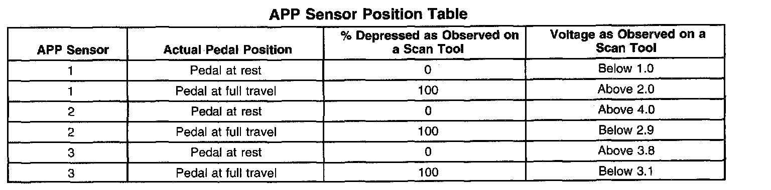 5. This step isolates an internal APP sensor failure. The condition may only occur at a certain accelerator pedal position. Monitoring the APP angles for sensor 1 and sensor 2 is an accurate way of verifying the actual position of the pedal. The APP angles for all 3 sensors should be within a few percent of each other. When the pedal is at rest the APP angle for all 3 sensors should be 0 percent, when the pedal is fully depressed all APP angles should be 100 percent.