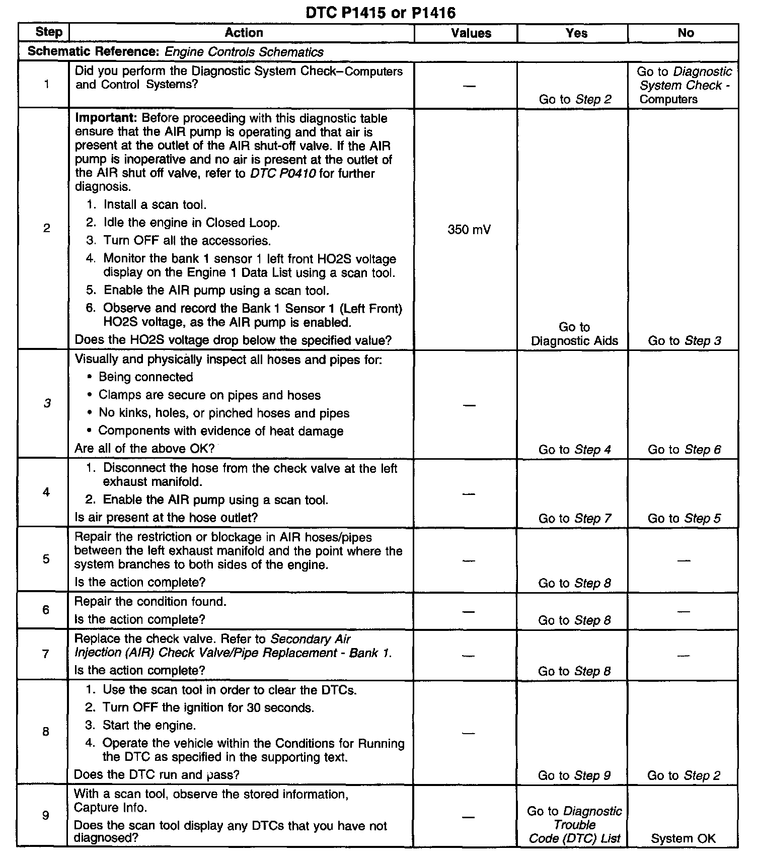 If the PCM determines that the HO2S voltages for both banks did not respond as expected during the tests, the Diagnostic Trouble Code (DTC) P0410 sets. If only one sensor responded, the PCM sets either a DTC P1415 or P1416 to indicate on which bank the AIR system is inoperative.