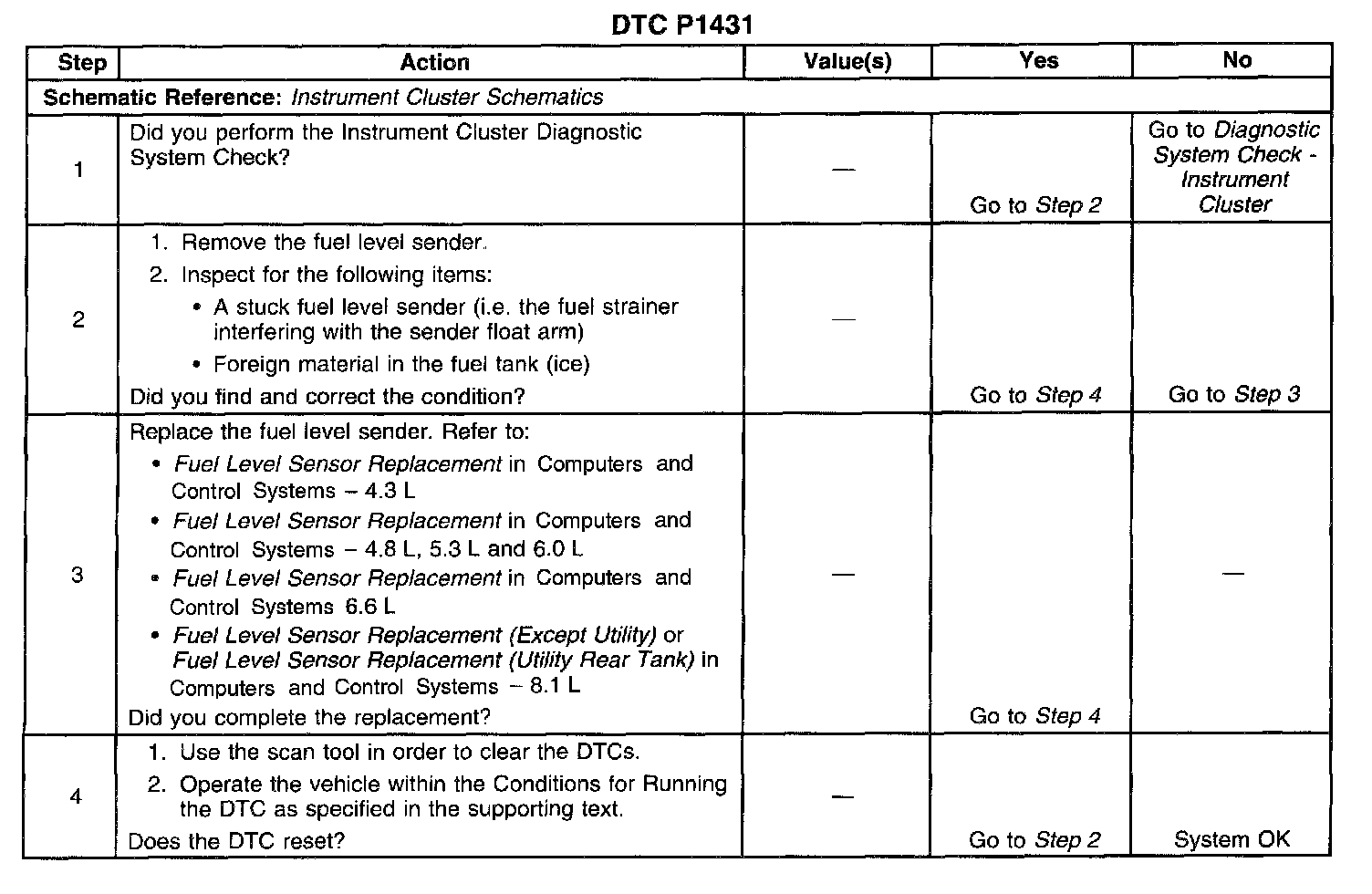CIRCUIT DESCRIPTIONThe fuel level sender changes resistance based on fuel level. The PCM monitors the signal circuit of the fuel level sender in order to determine fuel level. When the fuel tank is full, the sender resistance is high and the PCM senses a high signal voltage. When the fuel tank is empty, the sender resistance is low and the PCM senses a low signal voltage. The PCM uses the signal circuit of the fuel level sender in order to calculate the total remaining fuel %) in the tank. The PCM sends the fuel level percent via the class 2 serial data circuit to the instrument cluster in order to control the fuel gauge. The fuel level information is also used for misfire and EVAP diagnostics.