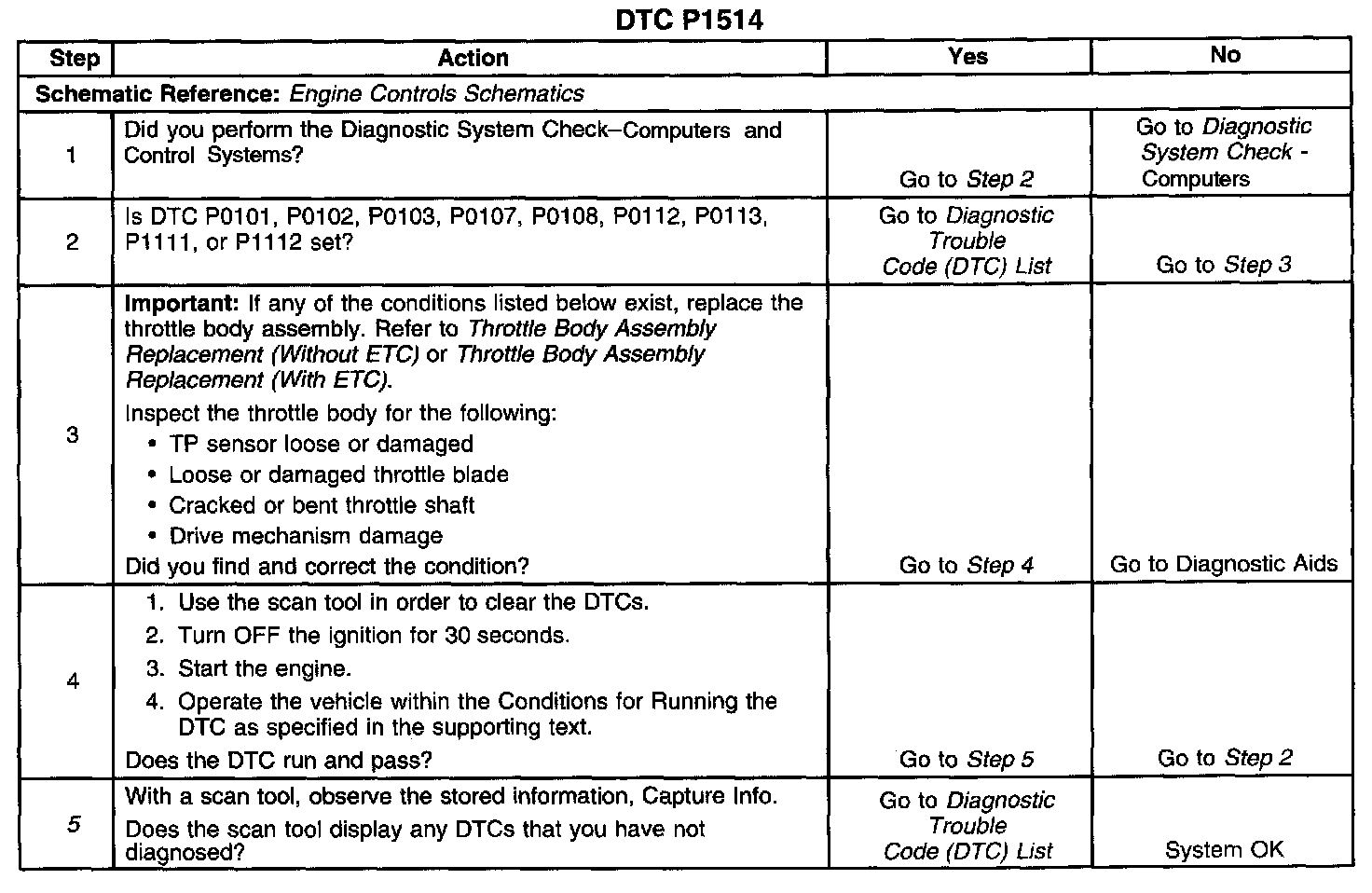 ^ Physically/visually inspect the throttle body assembly and correct any problems that you observe. Manually move the throttle blade from closed to Wide Open Throttle (WOT). You should not need to use excess force. The throttle blade should move smoothly through the full range and should return to a slightly open position on its own.