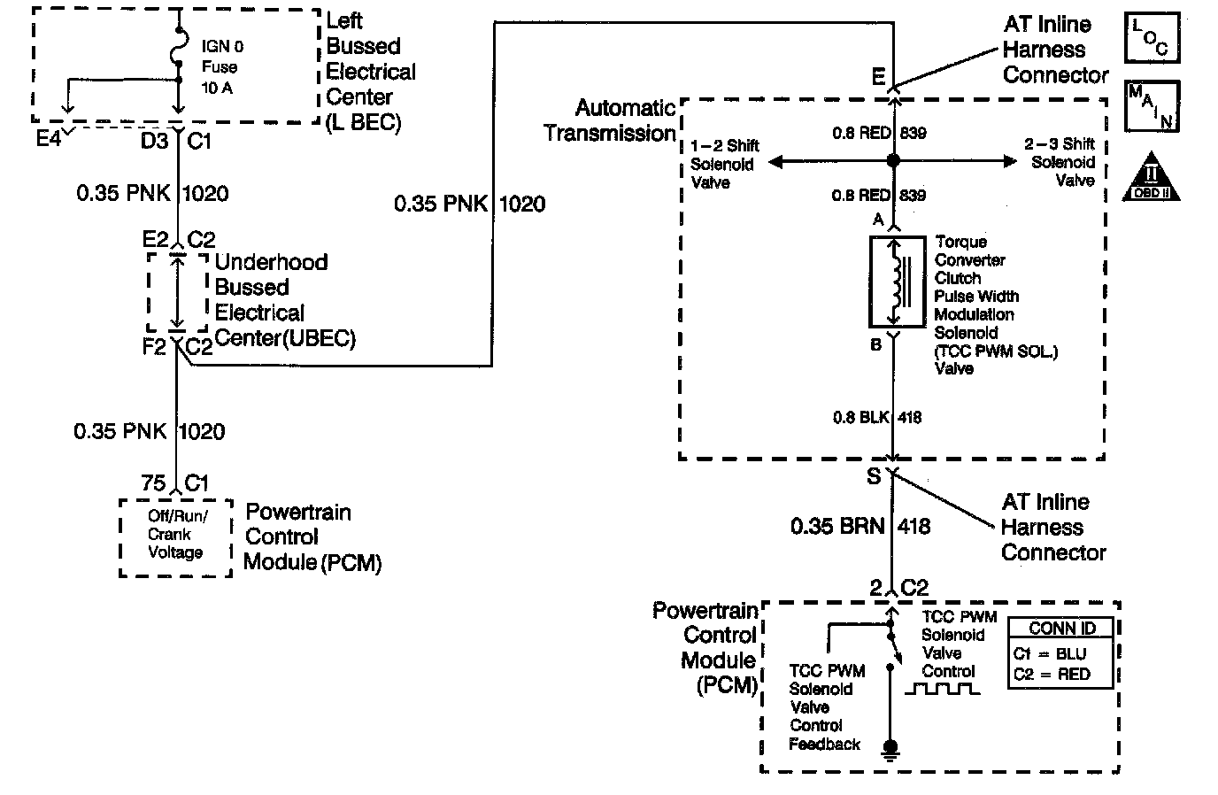 ^ The PCM commands the TCC PWM solenoid valve to OFF (0 percent) and the voltage input remains low (zero volts).