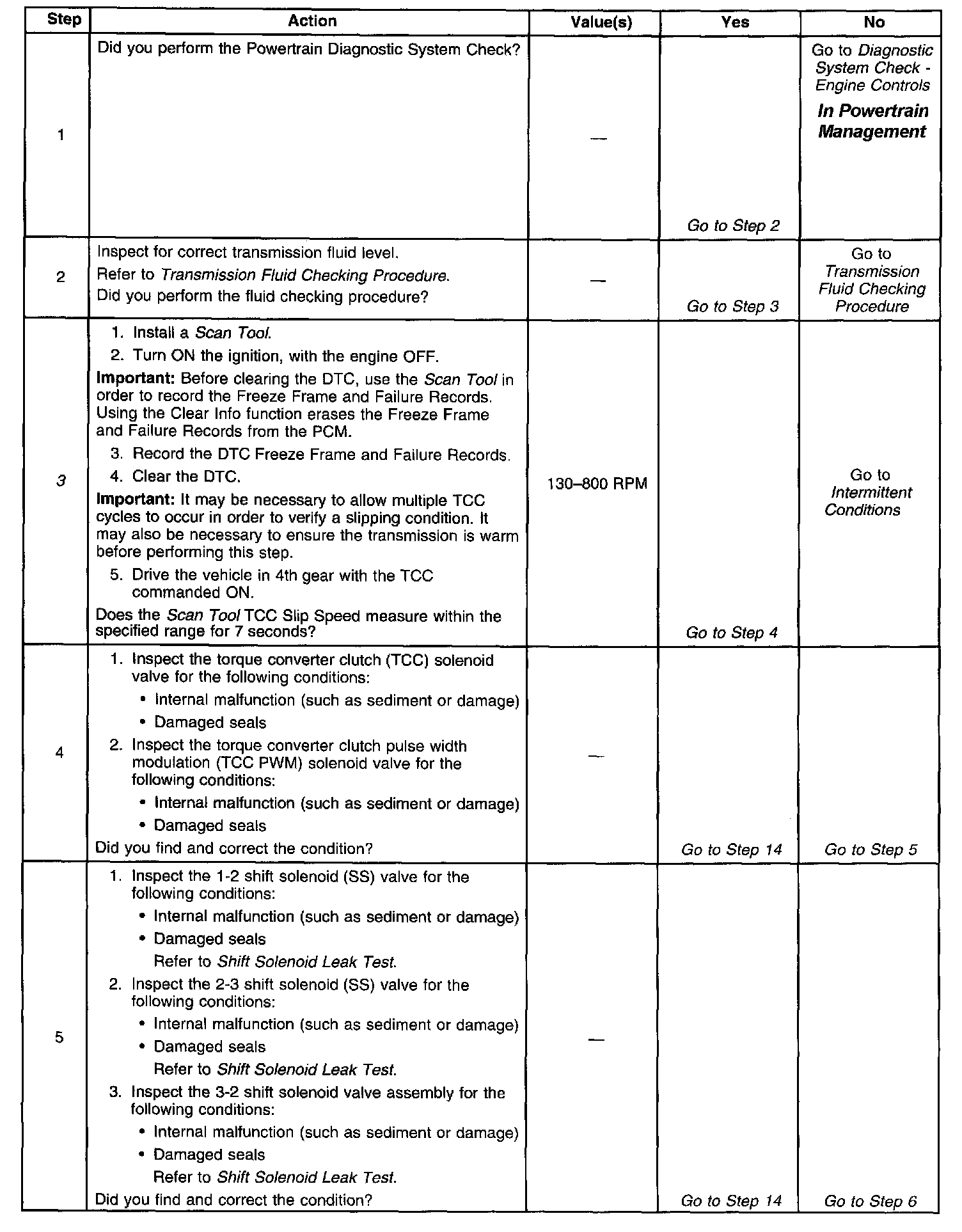 If the TCC is commanded ON for 5 seconds, the TCC is at 40 percent duty cycle for 5 seconds, the TP angle is 20-99 percent and the transmission slip counter has incremented to either 1 or 2 (out of 3 to increment the fail counter for the current ignition cycle), then the following slip conditions and actions may increment the fail counter for the current ignition cycle: