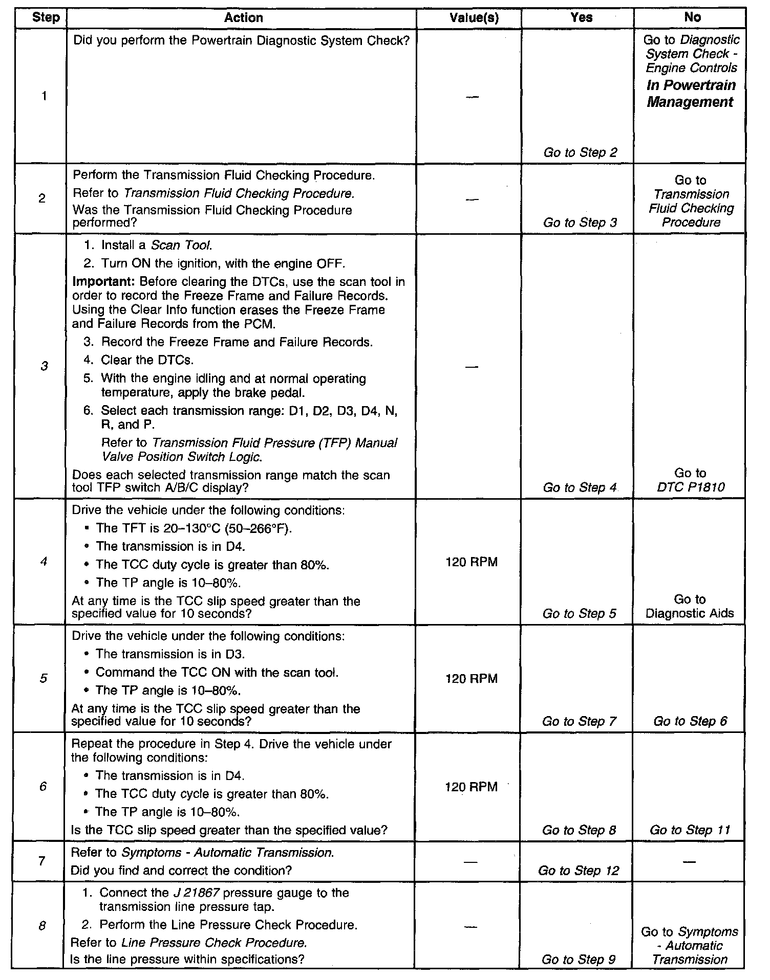^ The TCC slip speed is 100-550 for 12.5 seconds, the PCM commands the TCC Off for 2.0 seconds. The TCC slip speed is 100-550 for 15.0 seconds. Action Taken When the MIL/DTC Sets