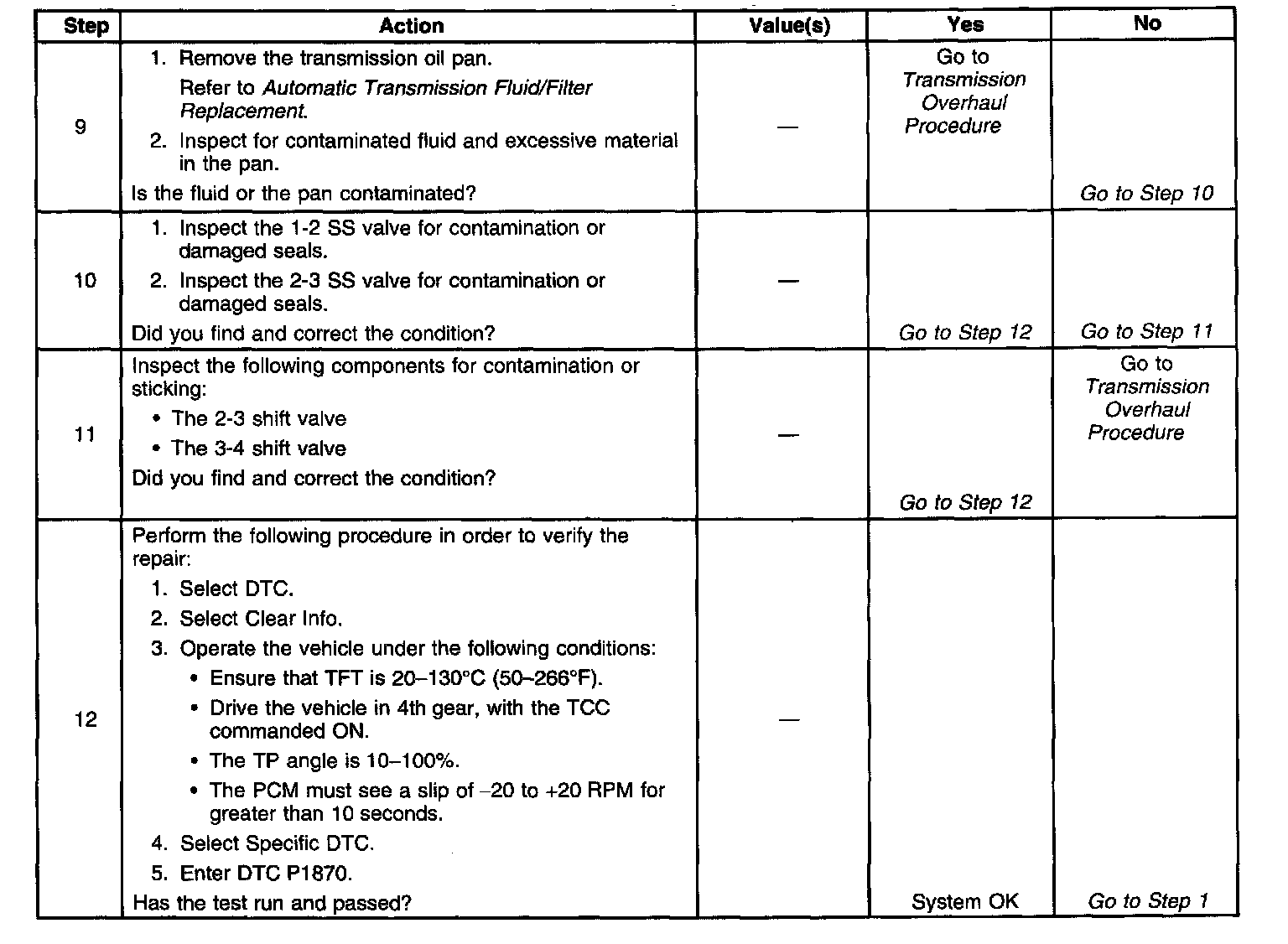 ^ The PCM detects slip in the torque converter clutch and/or the fourth gear clutch pack with the TCC in an apply or locked mode. DTC P1870 sets during the second consecutive trip when one of the following condition occurs: