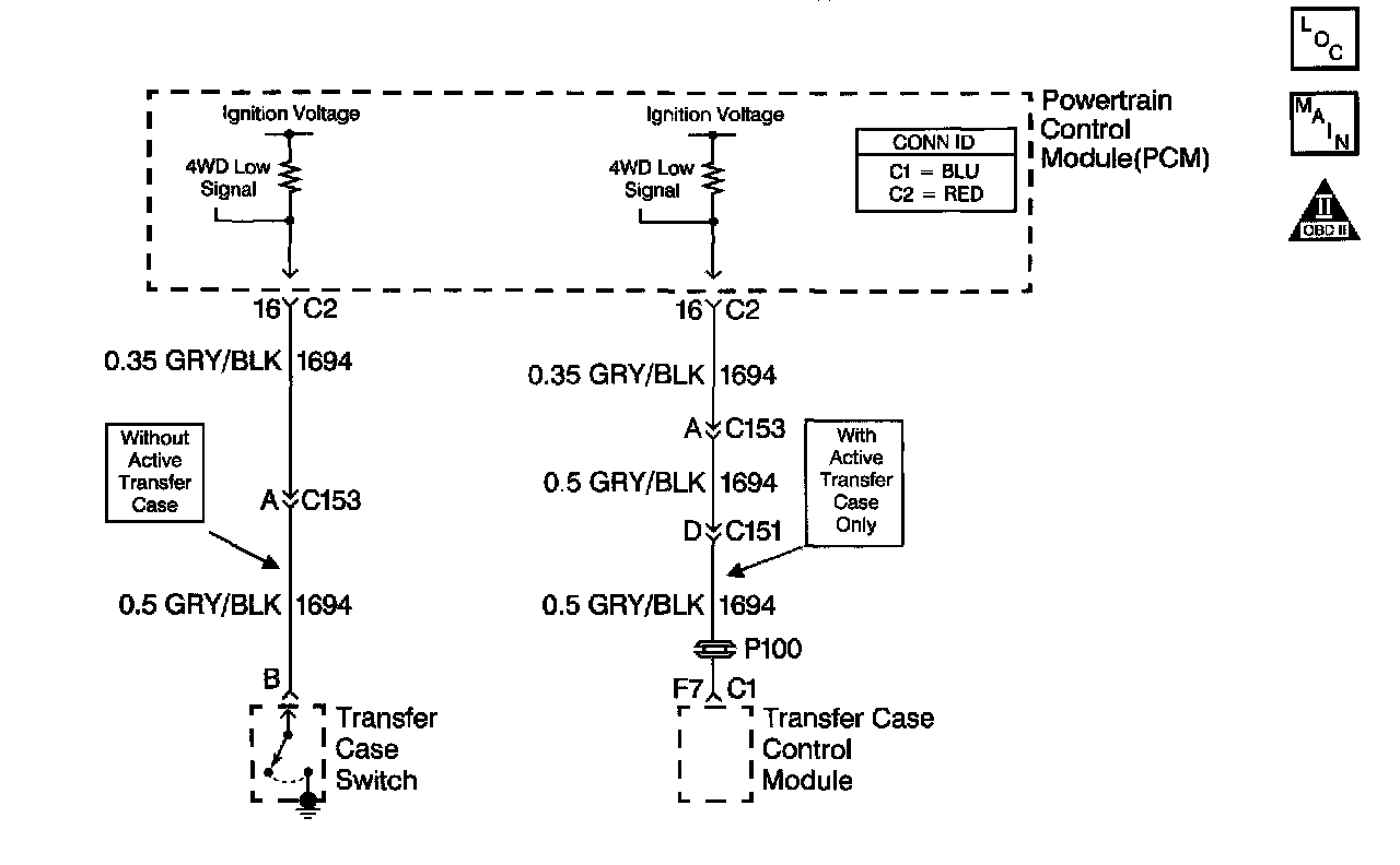 For vehicles not equipped with an active transfer case, the 4WD low circuit consists of the PCM, a transfer case switch and the circuit wiring. The transfer case switch controls the 4WD low signal on the signal circuit. When the operator selects 4WD low, the transfer case switch closes and the 4WD low signal voltage on the signal circuit changes from ignition voltage to zero volts. The PCM then compensates for transfer case gear reduction in the transmission Output Shaft Speed (OSS) sensor signal. The PCM uses the transmission OSS sensor signal to adjust shift points, line pressure and TCC scheduling.