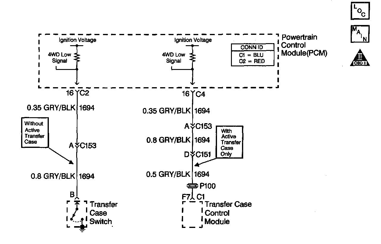 Vehicles not equipped with an active transfer case have a 4WD low circuit consisting of a PCM, transfer case switch and the circuit wiring. The transfer case switch is used to control the 4WD low signal circuit. When the operator moves the 4WD selector lever to 4WD low, the transfer case switch closes, and the 4WD low signal circuit changes from B+ voltage to zero volts. The PCM then compensates for transfer case gear reduction in the automatic transmission output (shaft) speed sensor (AT OSS) readings. The PCM uses the transmission OSS signal in order to adjust shift points, line pressure and TCC scheduling.