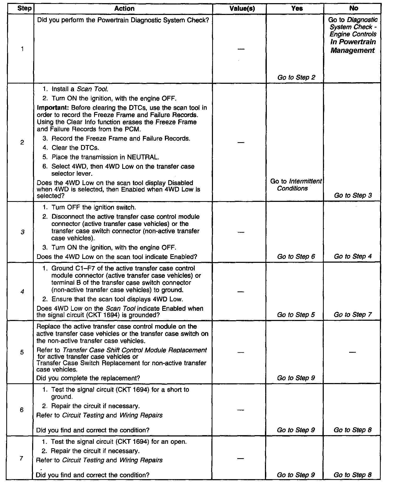 4. This step tests for an open in the signal circuit (CKT 1694), a faulty transfer case control module (active transfer case vehicles) or transfer case switch (non-active transfer case vehicles).