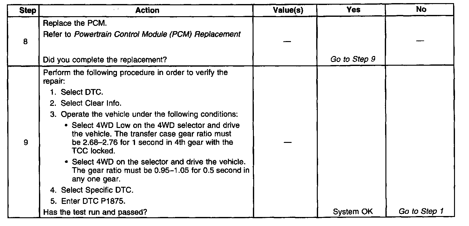 If the PCM detects a continuous open or short to ground in the 4WD low signal circuit, then DTC P1875 sets. DTC P1875 is a type C DTC. For California emissions vehicles DTC P1875 is a type B DTC.