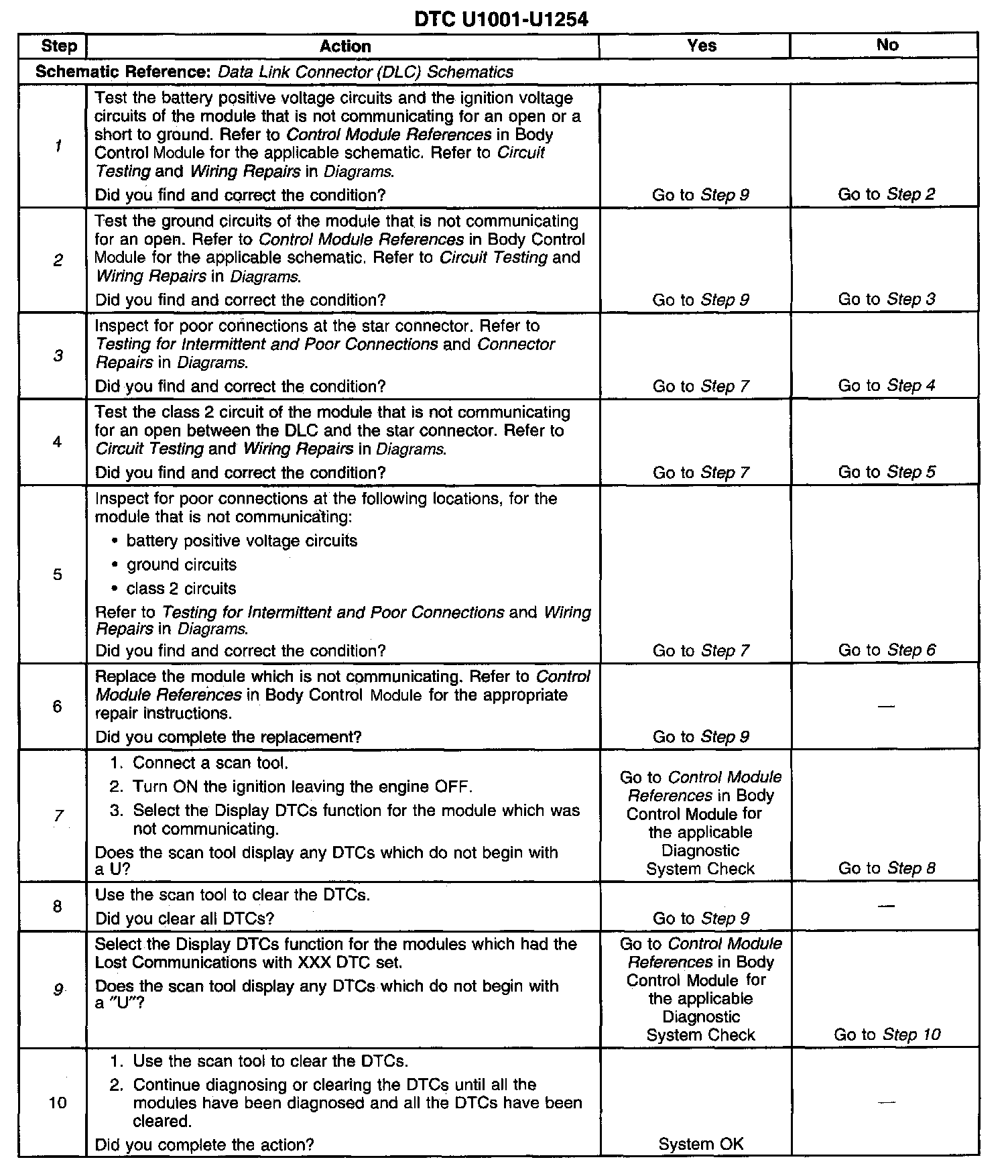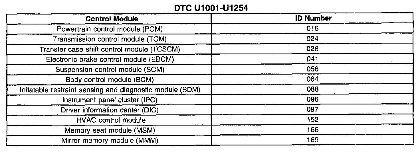 The Control Module ID Number list provides a method for determining which module is not communicating. A module with an internal class 2 serial data circuit malfunction or which loses power during the current ignition cycle would have a Lost Communication DTC set by other modules. Use the Control Module ID Number list in order to determine which module is not communicating and the Lost Communications with XXX diagnostic table in order to diagnose the malfunction. When no message is detected from a learned identification number for 5 seconds, a DTC U1xxx is set.