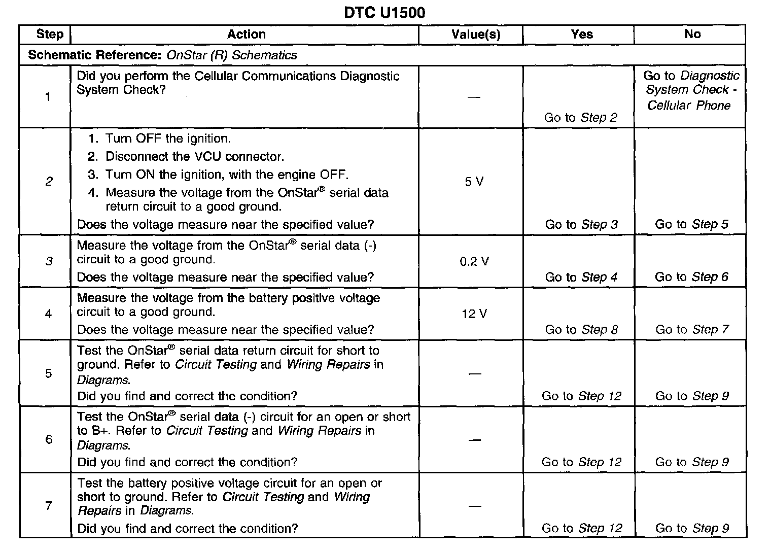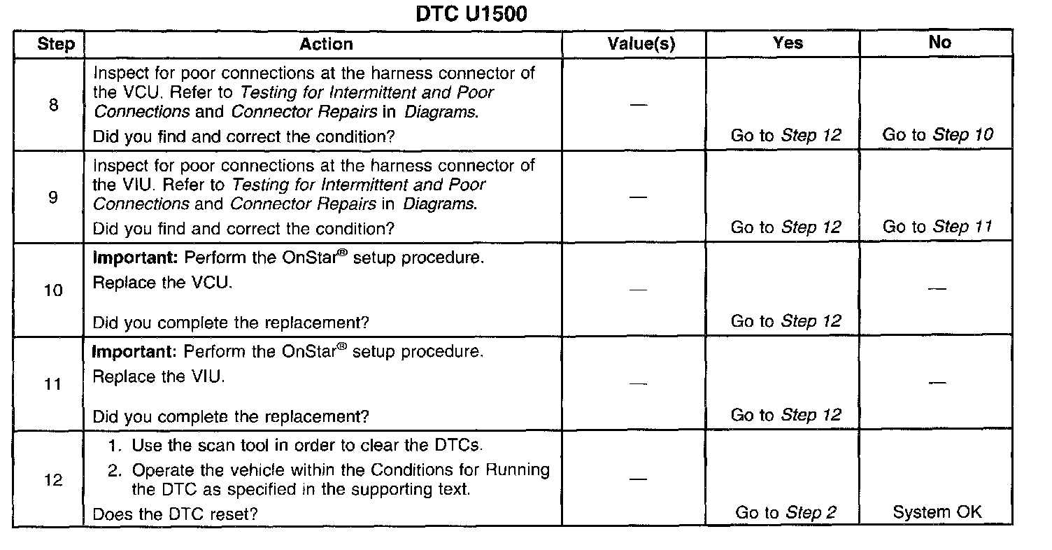 CIRCUIT DESCRIPTIONThe Vehicle Communication Unit (VCU) and the Vehicle Interface Unit (VIU) communicate using the OnStar(R) Serial Data (-) circuit, OnStar(R) Serial Data (+) circuit and the OnStar(R) Serial Data Return circuit. The DTC U1500 is set when the VIU detects no communication between the VIU and the VCU.