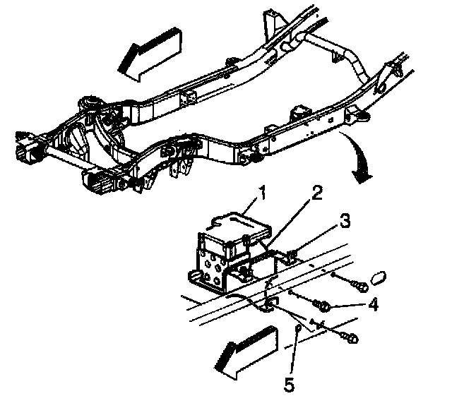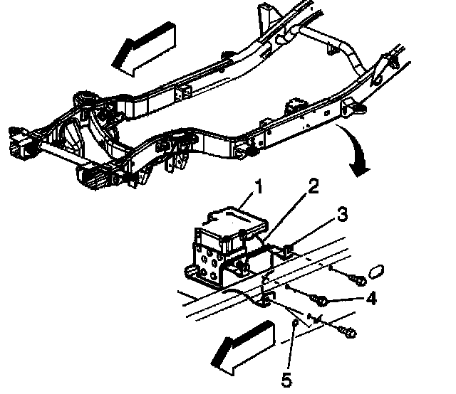 4. Loosen or remove the bolts (4) securing the EHCU mounting bracket (3) to the frame rail (5).