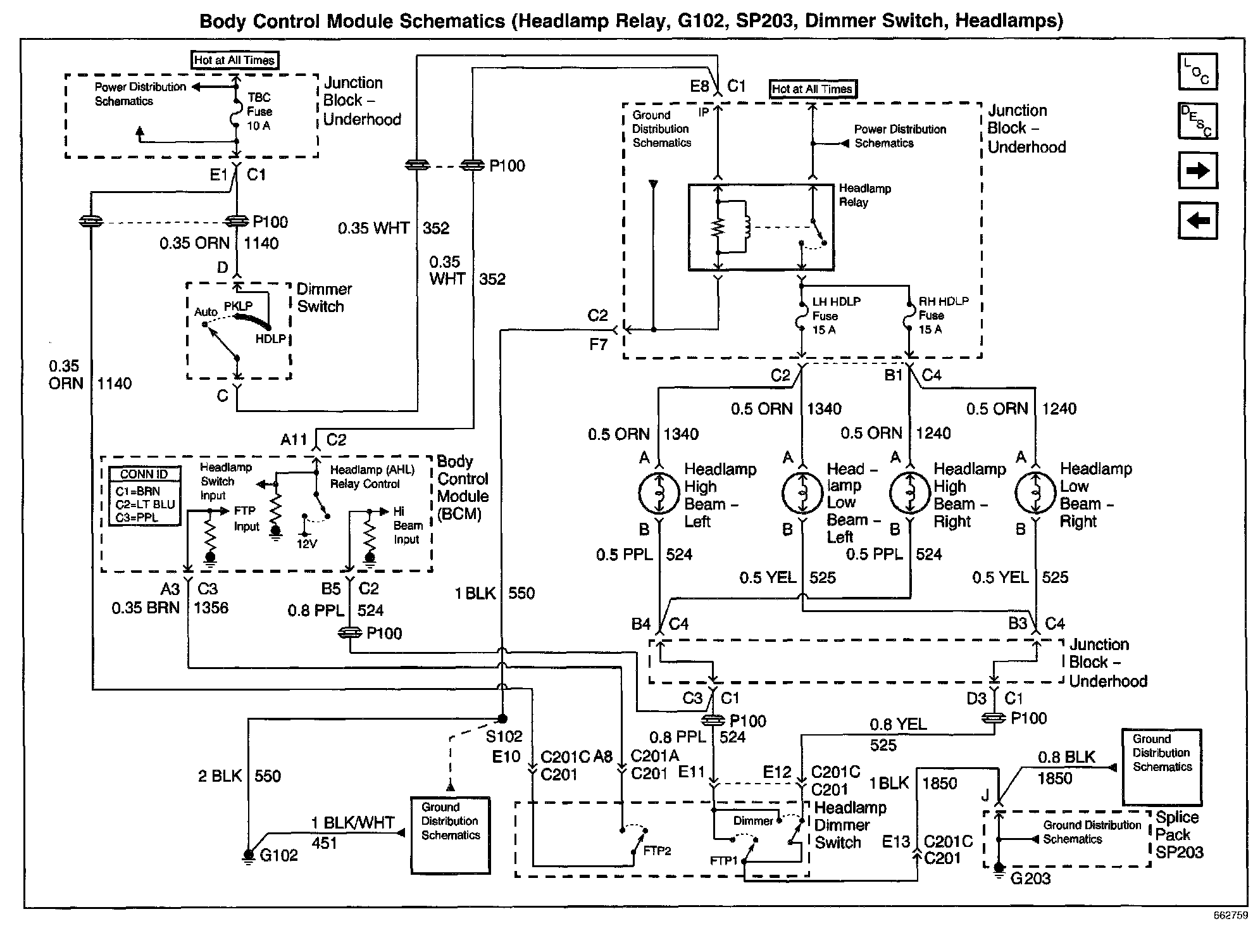 Body Control Module Schematics: Headlamp Relay, G102, SP203, Dimmer Switch, Headlamp: