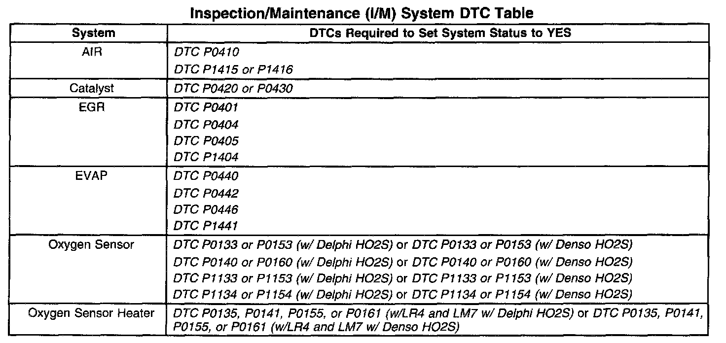 Inspection/Maintenance (I/M) System DTC Table: