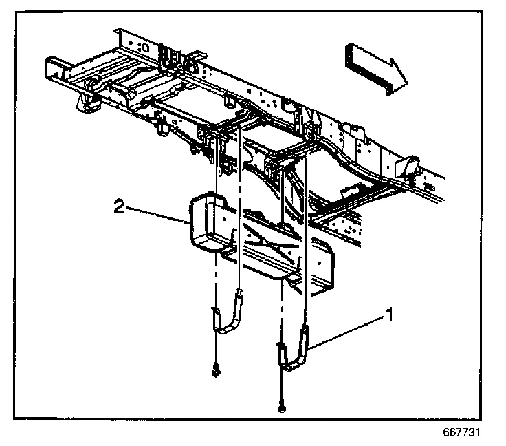 7. Remove the fuel tank strap attaching bolts (2).