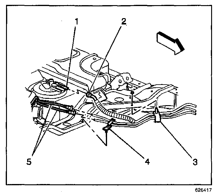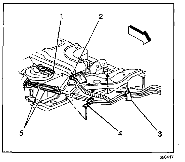 8. Disconnect the evaporative emission (EVAP) pipes at the rear tank EVAP pipes (5).