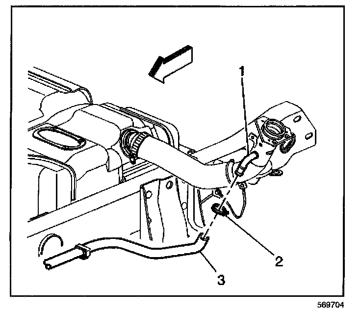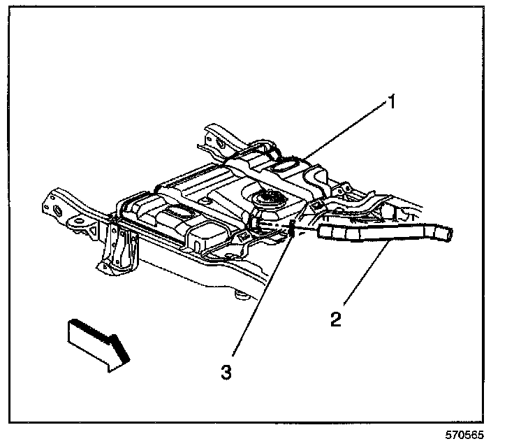 1. Connect the EVAP pipe to the fuel tank roll over valves (1, 3) and the retaining clips (2).