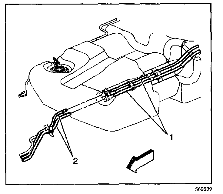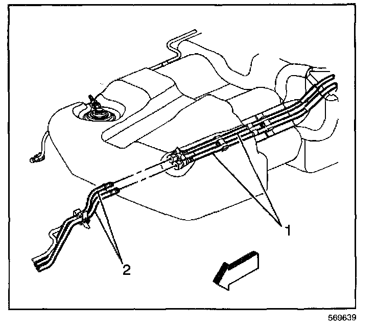 5. Disconnect the chassis fuel pipes (2) at the fuel tank pipes (1).