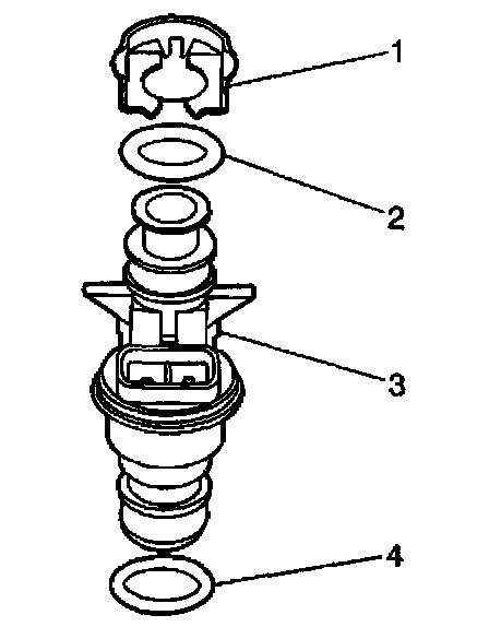 5. Remove the injector O-ring seals (2, 4) from both ends of the injector. Discard the O-ring seals.