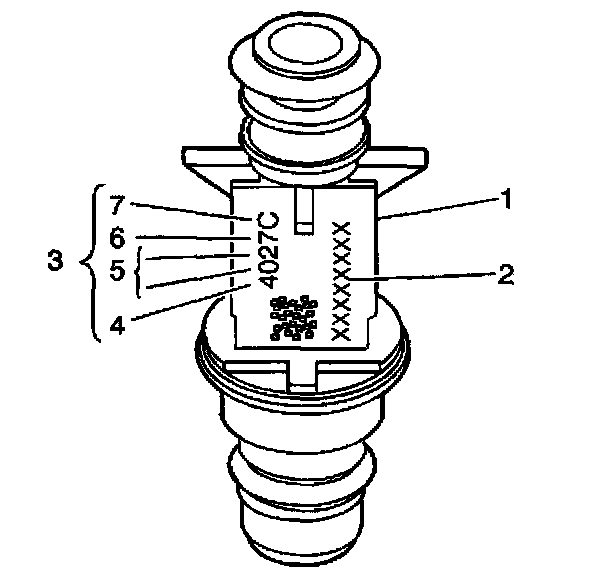 The fuel injector assembly (1) is stamped with a part number identification (2). A four-digit build date code (3) indicates the month (4), day (5), year (6), and the shift (7) that built the injector.