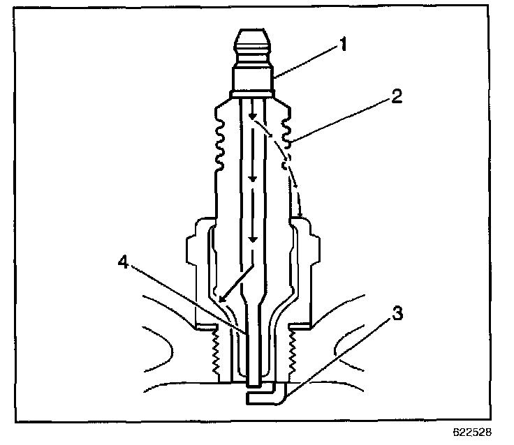 ^ Inspect the insulator (2) for cracks. All or part of the electrical charge may arc through the crack instead of the electrodes (3, 4).