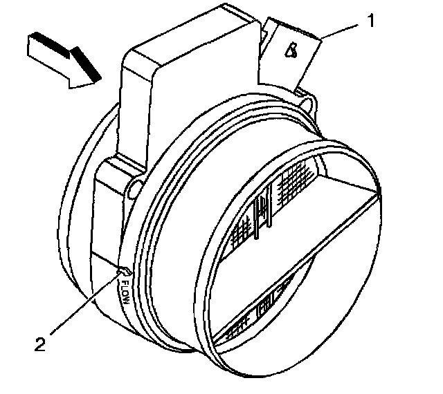 IMPORTANT: If the mass air flow/intake air temperature (MAF/IAT) sensor is installed backwards the fuel system goes rich. An arrow (2) cast into the plastic portion of the sensor indicates proper air flow direction. The arrow must point toward the engine.