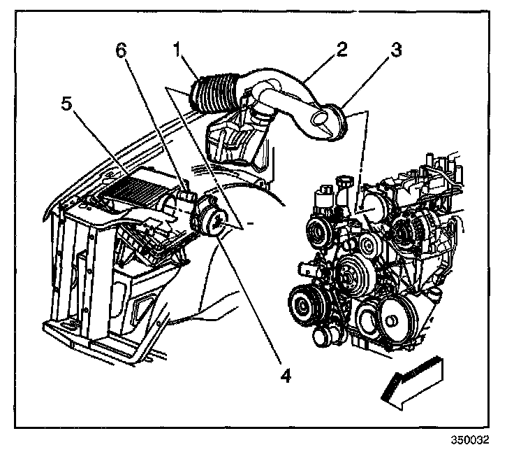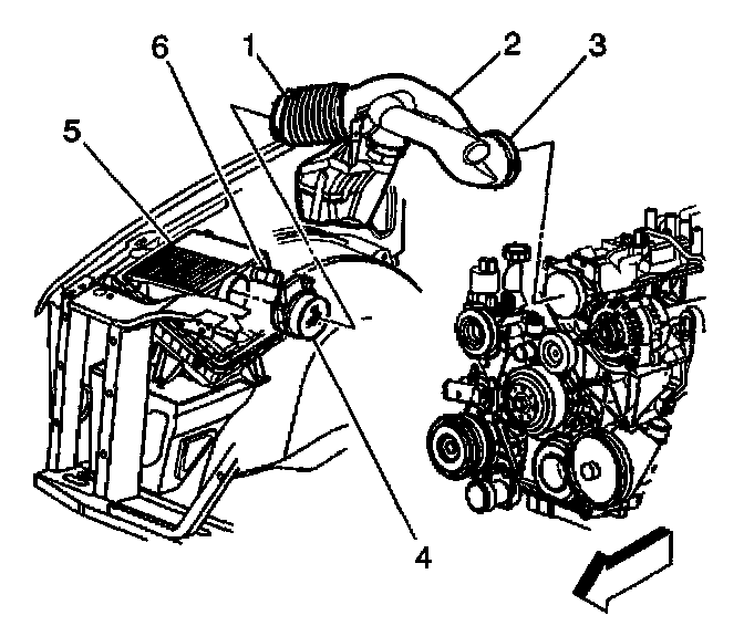 1. Loosen the clamps on the air intake duct (2) at the throttle body (3) and at the mass air flow/intake air temperature (MAF/IAT) sensor (1).