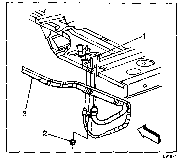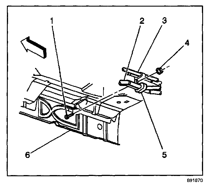 3. Install the heater/A/C tubes retaining nut (4) to the stud (1) at the frame (6).
