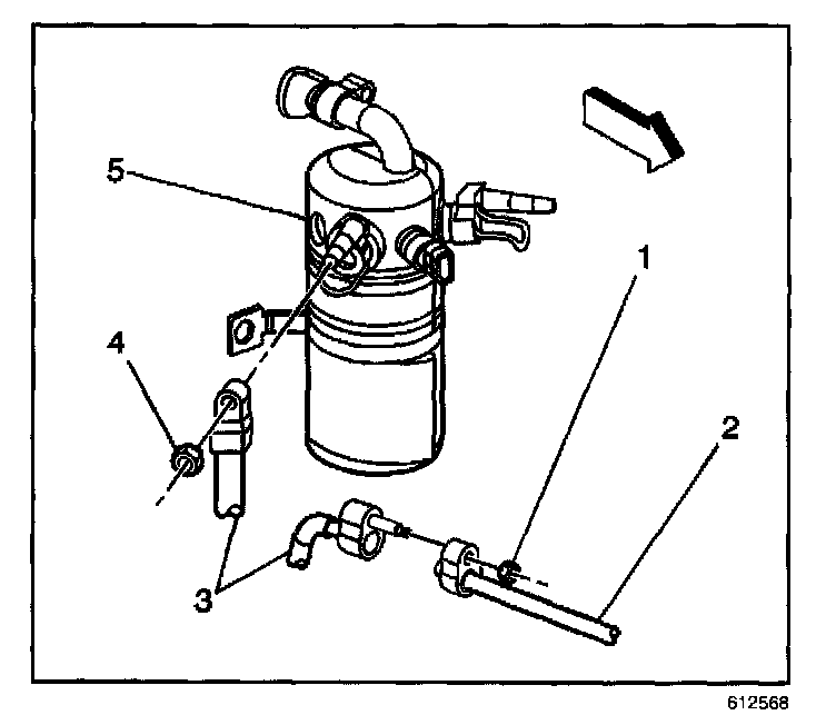 2. Remove the auxiliary A/C evaporator tubes (3) from the condenser tube (2) and the accumulator (5).